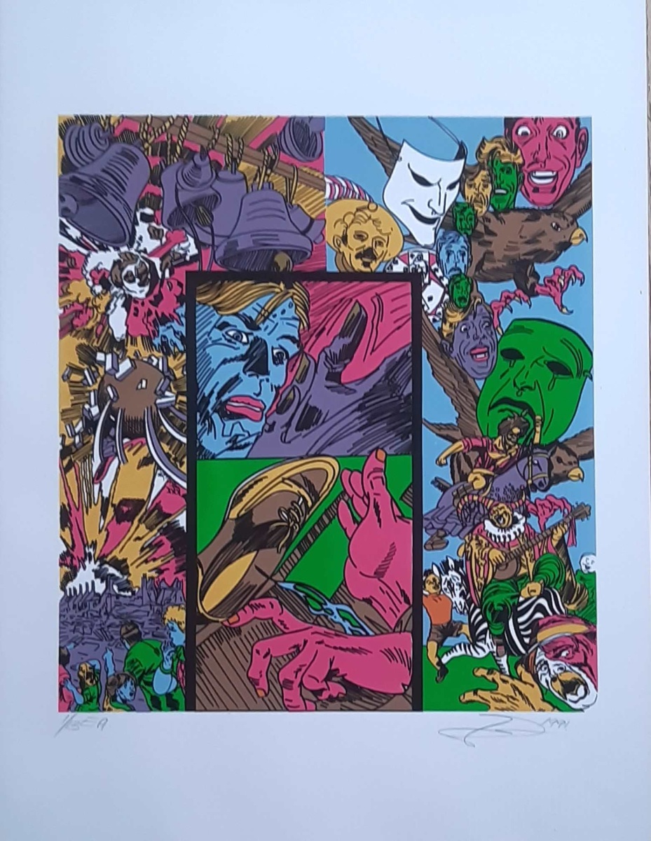 Fascinated by the world of images from the most diverse cultures, Erró collects everything he can glean here and there through comics, comics, alternative press, advertising, illustrations and other marginal publications. He uses this reservoir of images to create a whole world of little sketches, alternately funny, ironic or militant, which he transposes on the canvas and where everything is telescope in an explosive formal and chromatic jubilation.