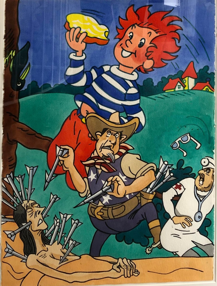 Fascinated by the world of images from the most diverse cultures, Erró collects everything he can glean here and there through comics, comics, alternative press, advertising, illustrations and other marginal publications. He uses this reservoir of images to create a whole world of little sketches, alternately funny, ironic or militant, which he transposes on the canvas and where everything is telescope in an explosive formal and chromatic jubilation.