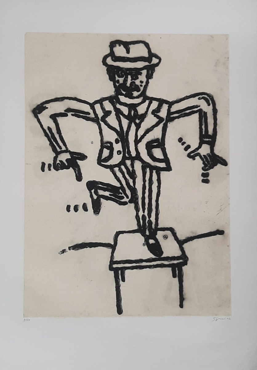 Au début de sa carrière, influencé par des artistes comme George Grosz ou Otto Dix, il pratiqua une figuration expressionniste d'où se dégageait de l'ironie. Peu à peu, sa figuration évolua vers l'absurde, construisant une sorte de théâtre sur la scène duquel s'ébat un homme en mouvement recherchant sa place dans le monde.