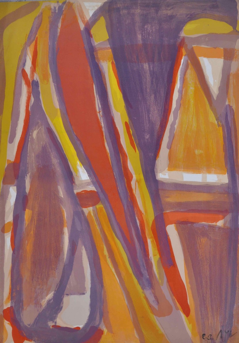 Bram van Velde (hollandais, né le 19 octobre 1895 à Zoeterwoude – mort le 28 décembre 1981 à Grimaud) est célèbre pour ses peintures abstraites et vivantes, représentant des formes expressives qui s’inspirent de l’abstraction lyrique française. Van Velde est né en Hollande et grandit dans une famille touchée par la pauvreté, ce qui l’affectera pour le reste de sa vie. Sa famille déménage à plusieurs reprises pour s’installer finalement à la Hague, où van Velde est apprenti pour une entreprise de peinture et de décoration d’intérieur et reproduit les œuvres des Maîtres anciens. Les propriétaires de l’entreprise deviennent les mécènes de van Velde, lui permettant de voyager à travers toute l’Europe où il fait connaissance avec les peintres expressionnistes, marquant alors une étape dans sa peinture.