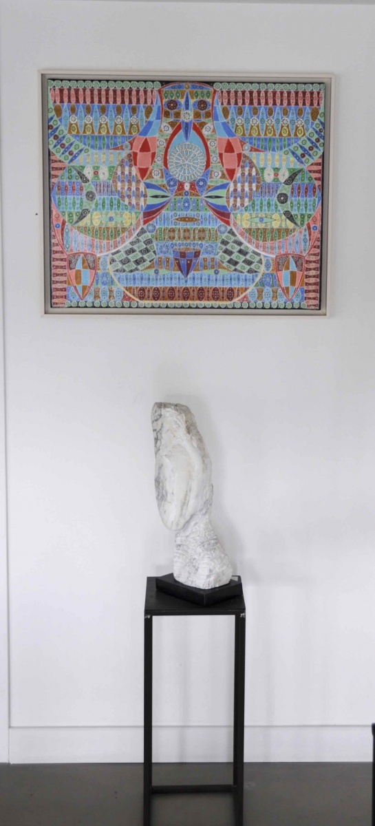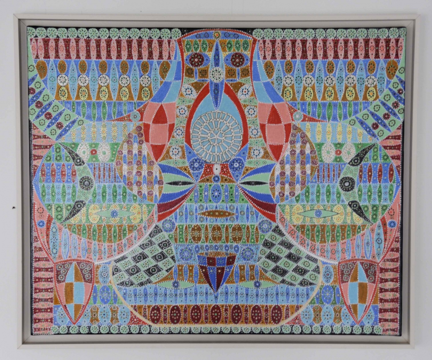 Arrière petit fils de Augustin Lesage. Autodidacte il prend les pinceaux en 1997. Depuis ce jour, il a peint plus de 300 tableaux dont certains lui ont pris plus de centaines d’heures.Il explique qu’il ne sait pas ce qu’il va réaliser, qu’il exprime des sensations liées à des voyages, dont l’Egypte où il refait le périple effectué par son arrière-grand-père en 1939. De l’accumulation de couleurs et de formes connues, parfois des visages, des têtes d’animaux, des formes connues ou inconnues apparaissent, des yeux ou des regards se multiplient sur la toile. Totalement effectué à mainlevée, la symétrie, la répétition de formes géométriques, les ponctuations de gouttelettes, l’influence orientale, rappellent les oeuvres d’Augustin Lesage, Victor Simon, Fleury Joseph Crépin ou de Stephan Novak. Cette proximité d’inspiration et de style pose la question d’un foyer créatif commun. 3 oeuvres de Christian Allard sont visibles au LAM dans cette belle exposition « Lesage, Simon, Crepin, peintres spirites et guérisseurs jusqu’au 5 janvier 2020.