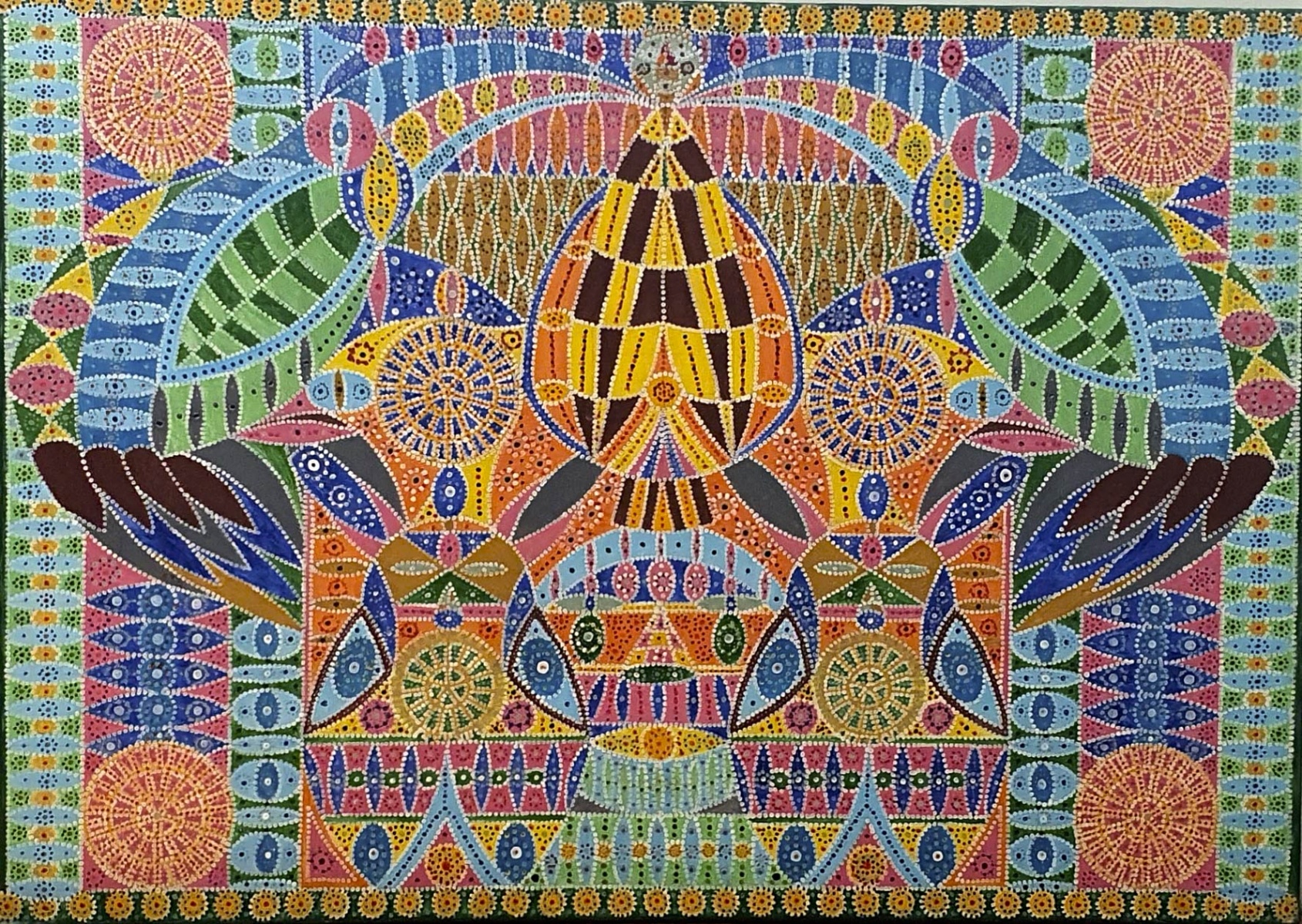 Arrière petit fils de Augustin Lesage. Autodidacte il prend les pinceaux en 1997. Depuis ce jour, il a peint plus de 300 tableaux dont certains lui ont pris plus de centaines d’heures.Il explique qu’il ne sait pas ce qu’il va réaliser, qu’il exprime des sensations liées à des voyages, dont l’Egypte où il refait le périple effectué par son arrière-grand-père en 1939. De l’accumulation de couleurs et de formes connues, parfois des visages, des têtes d’animaux, des formes connues ou inconnues apparaissent, des yeux ou des regards se multiplient sur la toile. Totalement effectué à mainlevée, la symétrie, la répétition de formes géométriques, les ponctuations de gouttelettes, l’influence orientale, rappellent les oeuvres d’Augustin Lesage, Victor Simon, Fleury Joseph Crépin ou de Stephan Novak. Cette proximité d’inspiration et de style pose la question d’un foyer créatif commun. 3 oeuvres de Christian Allard sont visibles au LAM dans cette belle exposition « Lesage, Simon, Crepin, peintres spirites et guérisseurs jusqu’au 5 janvier 2020.