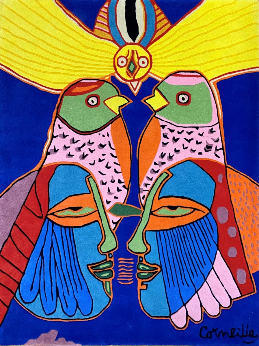 Sa première exposition individuelle en 1946, à Groningue, le montre déjà sensible aux aplats de Dufy, Matisse et Modigliani, puis il expose au Stedelijk Museum d’Amsterdam en 1947 et, en même temps qu’Appel, à la Gildehuys d’Amsterdam. Grâce à l’heureuse rencontre d’une dame hongroise, il se rend à Budapest, débutant ainsi sa destinée de nomade. Si le surnom de “géologue ailé” que lui donna Christian Dotremont était une image poétique, la vocation internationale de Corneille, comme celle de ses amis, était aussi une claire réaction au nationalisme des années hitlériennes. Cette première étape à Budapest, où l’attire l’entrelacs graphiques et éperdu des ruines et des herbes, est fondamentale pour l’approfondissement de sa poétique de libre recherche. Dans la librairie d’ Imre Pan, frère du surréaliste Arpad Mezei, il lit les poètes français, de Rimbaud aux surréalistes, et découvre la peinture de Miro et de Klee. Celui-ci semble parler plus que tout autre à l’âme du jeune Corneille. Les conquêtes que Klee accomplira sur le plan de la couleur, lors de son voyage à Tunis, nous rappellent celles de Corneille quand il se rendra à son tour en Tunisie en 1948 et en 1949. A Budapest, Corneille rencontre aussi le peintre français Jacques Doucet qui lui dévoilera le monde suffocant et triste des graffitis de prison.