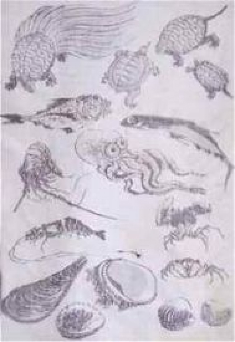 Estampes extraites de différents Mangwas contemporains de l'artiste. Artiste infatigable et grand voyageur dans son pays, il croquait tout ce qu'il voyait le long des routes et des villages qu'il traversait. Ces recueils édités en grand nombre nous donne une vision de la vie quotidienne au début du XIXè. siècle et un aperçu de l'immense talent de l'artiste