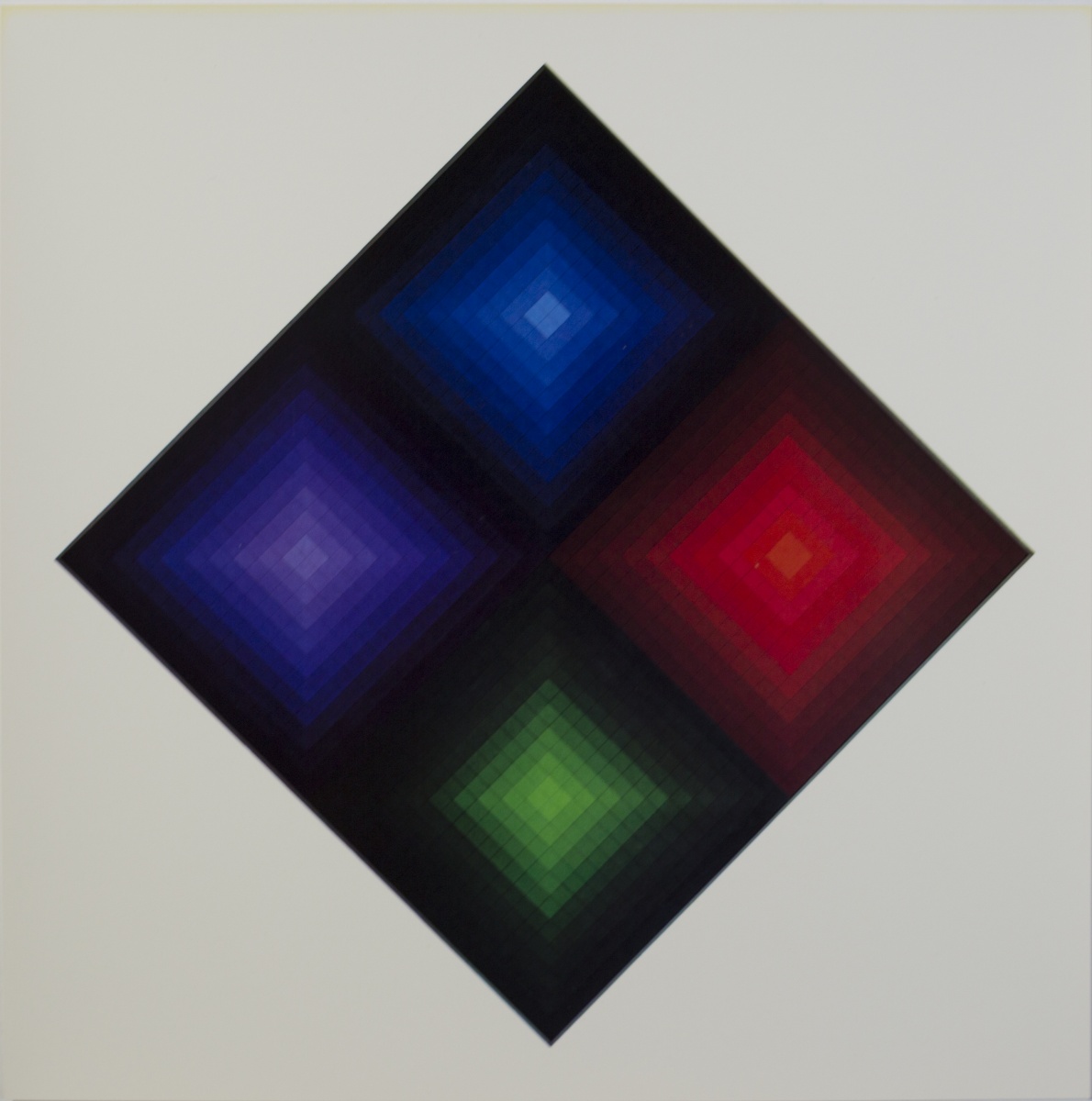 Victor Vasarely est un artiste franco-hongrois considéré comme étant à l’origine du mouvement Op Art ou art optique, que Bridget Riley et Yaacov Agam vont rejoindre. Les peintures et sculptures de Vasarely utilise des formes géométriques et des graphismes colorés pour créer des illusions de profondeur spatiale sur des surfaces à deux dimensions. Cette méthode abstraite de peinture, aussi connue sous le nom d’art cinétique, emprunte aux principes du Bauhaus, de Wassily Kandinsky et du constructivisme, ce qui aura un grand impact sur son travail. Né Vásárhelyi Gyozo le 9 avril 1906 à Pécs en Hongrie, l’artiste étudie d’abord la médecine, puis se tourne vers la peinture deux ans plus tard. Vasarely fréquente la branche hongroise du Bauhaus (Muhely) à Budapest à la fin des années 1920. Après s’être installé à Paris en 1930, Vasarely travaille en tant qu’artiste graphique et développe sa pratique de l’art abstrait géométrique. Il vit et travaille à Paris jusqu’à sa mort à l’âge de 90 ans le 15 mars 1997.