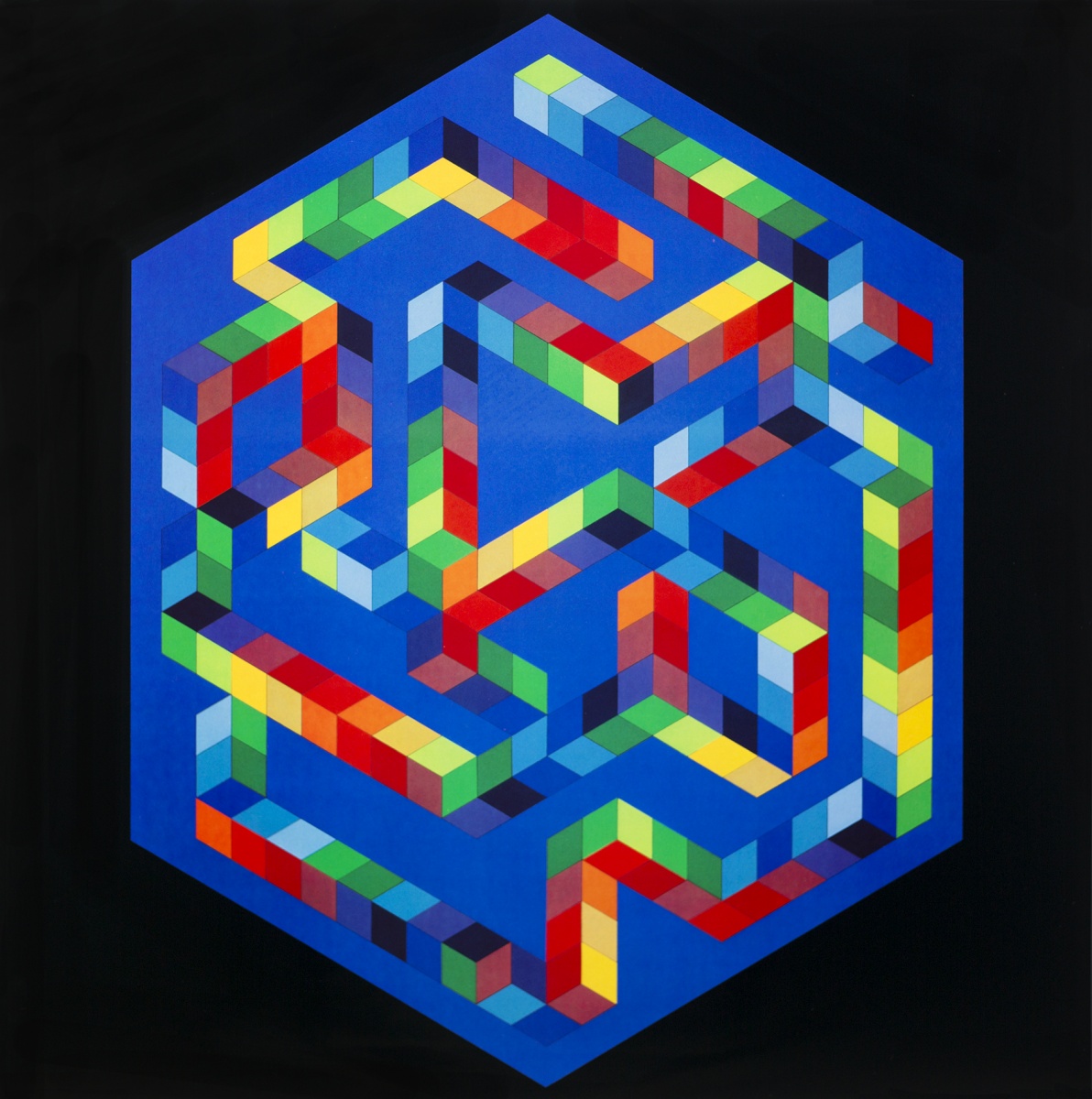 Victor Vasarely est un artiste franco-hongrois considéré comme étant à l’origine du mouvement Op Art ou art optique, que Bridget Riley et Yaacov Agam vont rejoindre. Les peintures et sculptures de Vasarely utilise des formes géométriques et des graphismes colorés pour créer des illusions de profondeur spatiale sur des surfaces à deux dimensions. Cette méthode abstraite de peinture, aussi connue sous le nom d’art cinétique, emprunte aux principes du Bauhaus, de Wassily Kandinsky et du constructivisme, ce qui aura un grand impact sur son travail. Né Vásárhelyi Gyozo le 9 avril 1906 à Pécs en Hongrie, l’artiste étudie d’abord la médecine, puis se tourne vers la peinture deux ans plus tard. Vasarely fréquente la branche hongroise du Bauhaus (Muhely) à Budapest à la fin des années 1920. Après s’être installé à Paris en 1930, Vasarely travaille en tant qu’artiste graphique et développe sa pratique de l’art abstrait géométrique. Il vit et travaille à Paris jusqu’à sa mort à l’âge de 90 ans le 15 mars 1997.