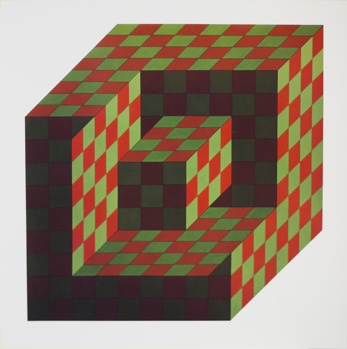 Victor Vasarely est un artiste franco-hongrois considéré comme étant à l’origine du mouvement Op Art ou art optique, que Bridget Riley et Yaacov Agam vont rejoindre. Les peintures et sculptures de Vasarely utilise des formes géométriques et des graphismes colorés pour créer des illusions de profondeur spatiale sur des surfaces à deux dimensions. Cette méthode abstraite de peinture, aussi connue sous le nom d’art cinétique, emprunte aux principes du Bauhaus, de Wassily Kandinsky et du constructivisme, ce qui aura un grand impact sur son travail. Né Vásárhelyi Gyozo le 9 avril 1906 à Pécs en Hongrie, l’artiste étudie d’abord la médecine, puis se tourne vers la peinture deux ans plus tard. Vasarely fréquente la branche hongroise du Bauhaus (Muhely) à Budapest à la fin des années 1920. Après s’être installé à Paris en 1930, Vasarely travaille en tant qu’artiste graphique et développe sa pratique de l’art abstrait géométrique. Il vit et travaille à Paris jusqu’à sa mort à l’âge de 90 ans le 15 mars 1997.