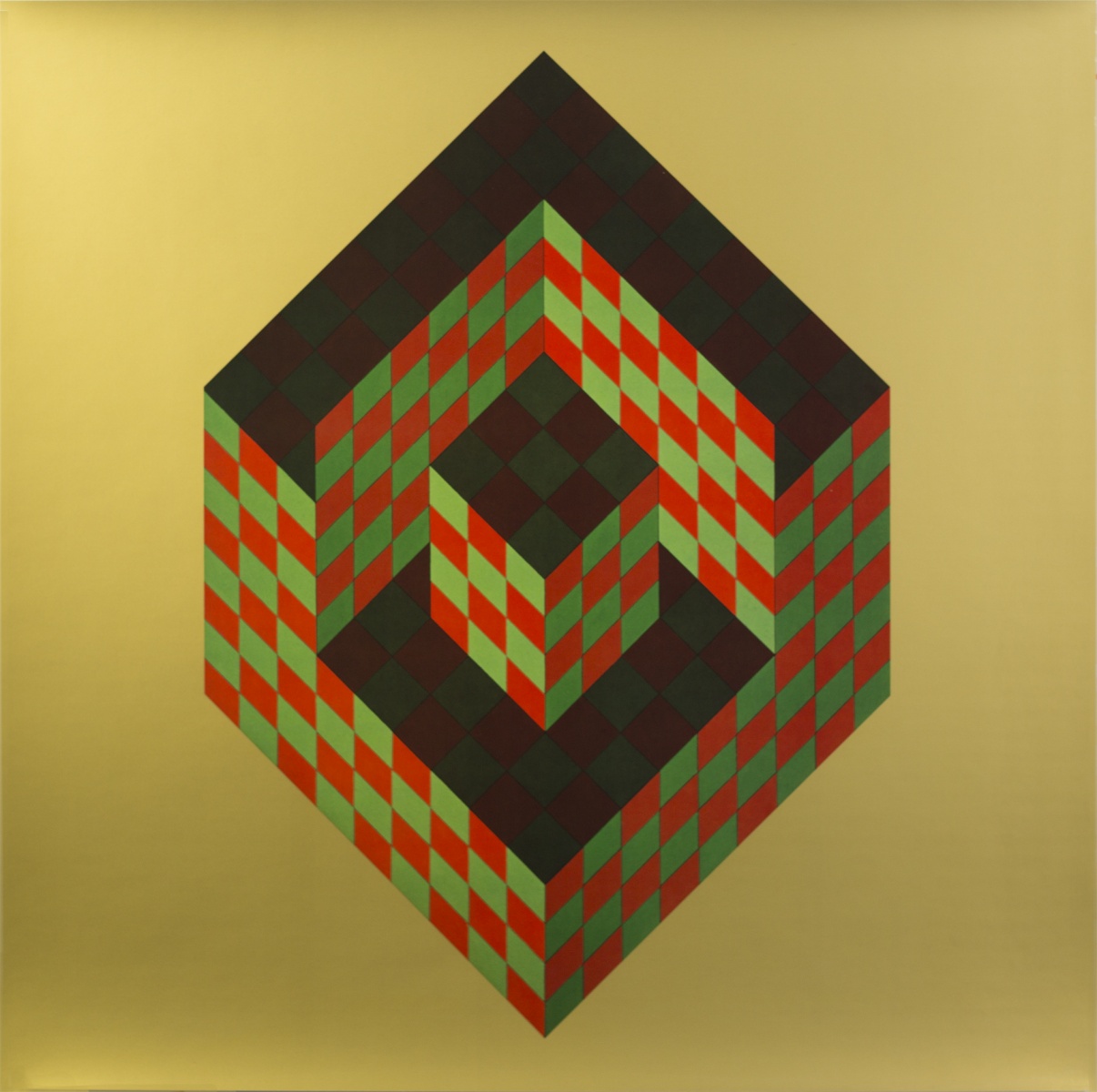 Victor Vasarely est un artiste franco-hongrois considéré comme étant à l’origine du mouvement Op Art ou art optique, que Bridget Riley et Yaacov Agam vont rejoindre. Les peintures et sculptures de Vasarely utilise des formes géométriques et des graphismes colorés pour créer des illusions de profondeur spatiale sur des surfaces à deux dimensions. Cette méthode abstraite de peinture, aussi connue sous le nom d’art cinétique, emprunte aux principes du Bauhaus, de Wassily Kandinsky et du constructivisme, ce qui aura un grand impact sur son travail. Né Vásárhelyi Gyozo le 9 avril 1906 à Pécs en Hongrie, l’artiste étudie d’abord la médecine, puis se tourne vers la peinture deux ans plus tard. Vasarely fréquente la branche hongroise du Bauhaus (Muhely) à Budapest à la fin des années 1920. Après s’être installé à Paris en 1930, Vasarely travaille en tant qu’artiste graphique et développe sa pratique de l’art abstrait géométrique. Il vit et travaille à Paris jusqu’à sa mort à l’âge de 90 ans le 15 mars 1997.