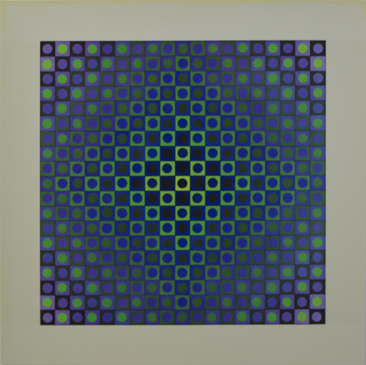 Victor Vasarely est un artiste franco-hongrois considéré comme étant à l’origine du mouvement Op Art ou art optique, que Bridget Riley et Yaacov Agam vont rejoindre. Les peintures et sculptures de Vasarely utilise des formes géométriques et des graphismes colorés pour créer des illusions de profondeur spatiale sur des surfaces à deux dimensions. Cette méthode abstraite de peinture, aussi connue sous le nom d’art cinétique, emprunte aux principes du Bauhaus, de Wassily Kandinsky et du constructivisme, ce qui aura un grand impact sur son travail. Né Vásárhelyi Gyozo le 9 avril 1906 à Pécs en Hongrie, l’artiste étudie d’abord la médecine, puis se tourne vers la peinture deux ans plus tard. Vasarely fréquente la branche hongroise du Bauhaus (Muhely) à Budapest à la fin des années 1920. Après s’être installé à Paris en 1930, Vasarely travaille en tant qu’artiste graphique et développe sa pratique de l’art abstrait géométrique. Il vit et travaille à Paris jusqu’à sa mort à l’âge de 90 ans le 15 mars 1997.
