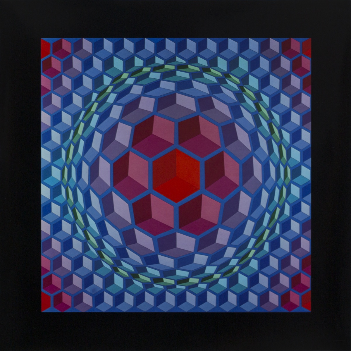 Victor Vasarely est un artiste franco-hongrois considéré comme étant à l’origine du mouvement Op Art ou art optique, que Bridget Riley et Yaacov Agam vont rejoindre. Les peintures et sculptures de Vasarely utilise des formes géométriques et des graphismes colorés pour créer des illusions de profondeur spatiale sur des surfaces à deux dimensions. Cette méthode abstraite de peinture, aussi connue sous le nom d’art cinétique, emprunte aux principes du Bauhaus, de Wassily Kandinsky et du constructivisme, ce qui aura un grand impact sur son travail. Né Vásárhelyi Gyozo le 9 avril 1906 à Pécs en Hongrie, l’artiste étudie d’abord la médecine, puis se tourne vers la peinture deux ans plus tard. Vasarely fréquente la branche hongroise du Bauhaus (Muhely) à Budapest à la fin des années 1920. Après s’être installé à Paris en 1930, Vasarely travaille en tant qu’artiste graphique et développe sa pratique de l’art abstrait géométrique. Il vit et travaille à Paris jusqu’à sa mort à l’âge de 90 ans le 15 mars 1997.