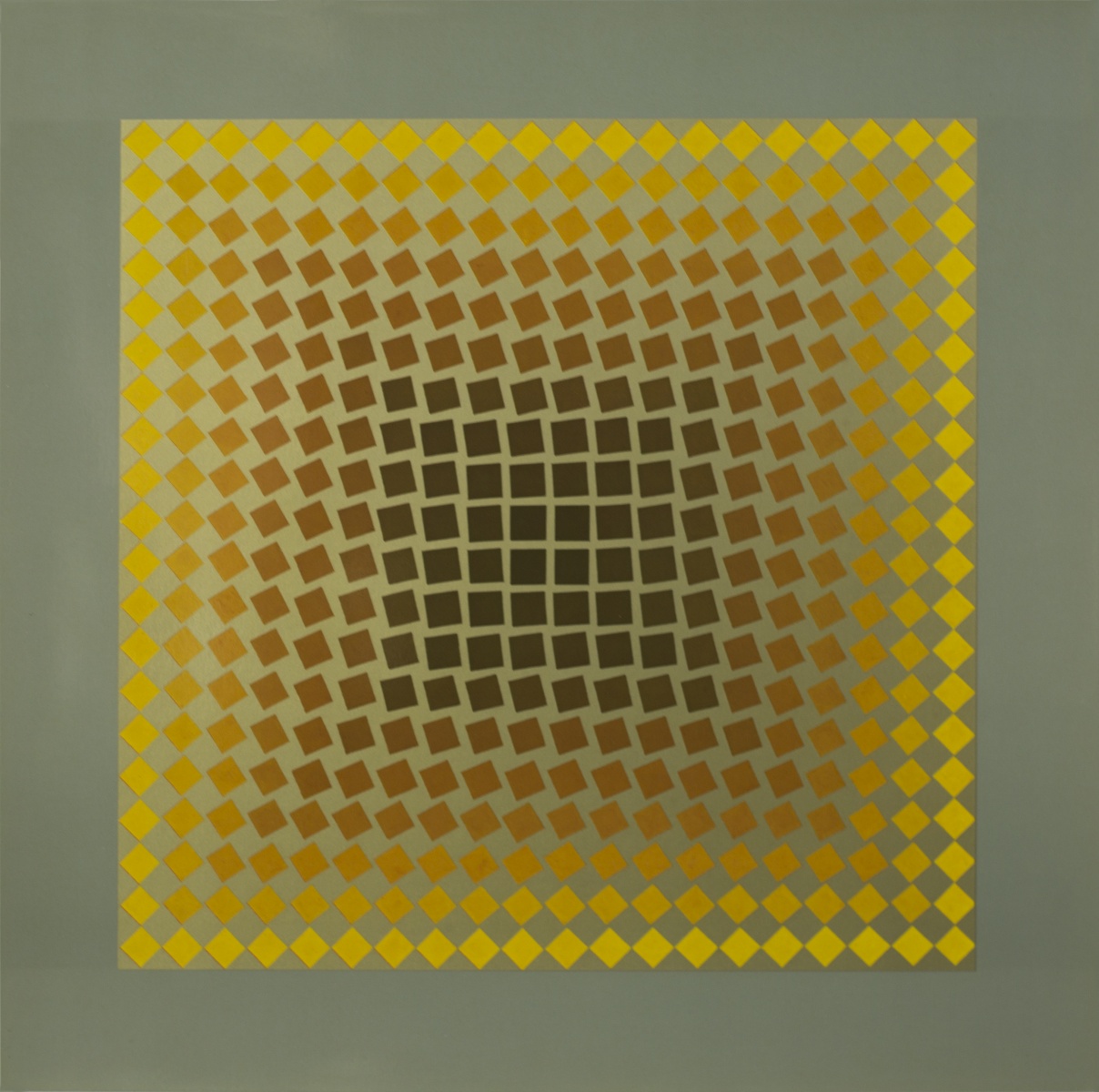 Victor Vasarely est un artiste franco-hongrois considéré comme étant à l’origine du mouvement Op Art ou art optique, que Bridget Riley et Yaacov Agam vont rejoindre. Les peintures et sculptures de Vasarely utilise des formes géométriques et des graphismes colorés pour créer des illusions de profondeur spatiale sur des surfaces à deux dimensions. Cette méthode abstraite de peinture, aussi connue sous le nom d’art cinétique, emprunte aux principes du Bauhaus, de Wassily Kandinsky et du constructivisme, ce qui aura un grand impact sur son travail. Né Vásárhelyi Gyozo le 9 avril 1906 à Pécs en Hongrie, l’artiste étudie d’abord la médecine, puis se tourne vers la peinture deux ans plus tard. Vasarely fréquente la branche hongroise du Bauhaus (Muhely) à Budapest à la fin des années 1920. Après s’être installé à Paris en 1930, Vasarely travaille en tant qu’artiste graphique et développe sa pratique de l’art abstrait géométrique. Il vit et travaille à Paris jusqu’à sa mort à l’âge de 90 ans le 15 mars 1997.