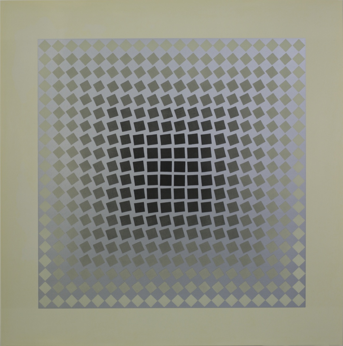 Victor Vasarely est un artiste franco-hongrois considéré comme étant à l’origine du mouvement Op Art ou art optique, que Bridget Riley et Yaacov Agam vont rejoindre. Les peintures et sculptures de Vasarely utilise des formes géométriques et des graphismes colorés pour créer des illusions de profondeur spatiale sur des surfaces à deux dimensions. Cette méthode abstraite de peinture, aussi connue sous le nom d’art cinétique, emprunte aux principes du Bauhaus, de Wassily Kandinsky et du constructivisme, ce qui aura un grand impact sur son travail. Né Vásárhelyi Gyozo le 9 avril 1906 à Pécs en Hongrie, l’artiste étudie d’abord la médecine, puis se tourne vers la peinture deux ans plus tard. Vasarely fréquente la branche hongroise du Bauhaus (Muhely) à Budapest à la fin des années 1920. Après s’être installé à Paris en 1930, Vasarely travaille en tant qu’artiste graphique et développe sa pratique de l’art abstrait géométrique. Il vit et travaille à Paris jusqu’à sa mort à l’âge de 90 ans le 15 mars 1997.
