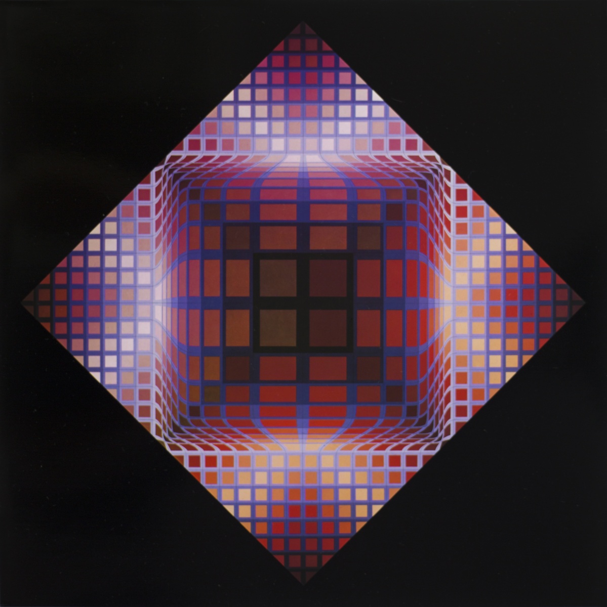 Victor Vasarely est un artiste franco-hongrois considéré comme étant à l’origine du mouvement Op Art ou art optique, que Bridget Riley et Yaacov Agam vont rejoindre. Les peintures et sculptures de Vasarely utilise des formes géométriques et des graphismes colorés pour créer des illusions de profondeur spatiale sur des surfaces à deux dimensions. Cette méthode abstraite de peinture, aussi connue sous le nom d’art cinétique, emprunte aux principes du Bauhaus, de Wassily Kandinsky et du constructivisme, ce qui aura un grand impact sur son travail. Né Vásárhelyi Gyozo le 9 avril 1906 à Pécs en Hongrie, l’artiste étudie d’abord la médecine, puis se tourne vers la peinture deux ans plus tard. Vasarely fréquente la branche hongroise du Bauhaus (Muhely) à Budapest à la fin des années 1920. Après s’être installé à Paris en 1930, Vasarely travaille en tant qu’artiste graphique et développe sa pratique de l’art abstrait géométrique. Il vit et travaille à Paris jusqu’à sa mort à l’âge de 90 ans le 15 mars 1997.