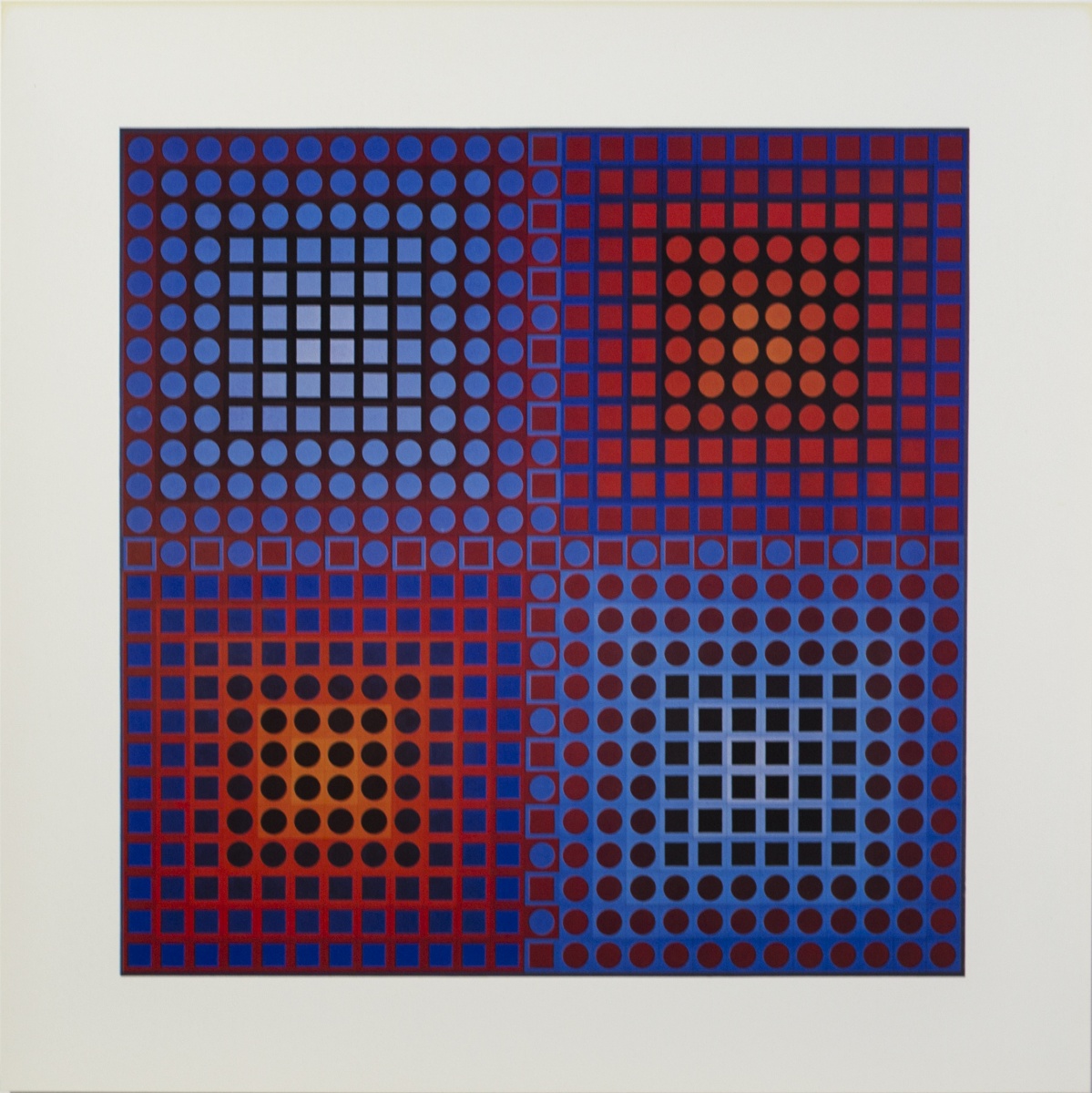 Victor Vasarely est un artiste franco-hongrois considéré comme étant à l’origine du mouvement Op Art ou art optique, que Bridget Riley et Yaacov Agam vont rejoindre. Les peintures et sculptures de Vasarely utilise des formes géométriques et des graphismes colorés pour créer des illusions de profondeur spatiale sur des surfaces à deux dimensions. Cette méthode abstraite de peinture, aussi connue sous le nom d’art cinétique, emprunte aux principes du Bauhaus, de Wassily Kandinsky et du constructivisme, ce qui aura un grand impact sur son travail. Né Vásárhelyi Gyozo le 9 avril 1906 à Pécs en Hongrie, l’artiste étudie d’abord la médecine, puis se tourne vers la peinture deux ans plus tard. Vasarely fréquente la branche hongroise du Bauhaus (Muhely) à Budapest à la fin des années 1920. Après s’être installé à Paris en 1930, Vasarely travaille en tant qu’artiste graphique et développe sa pratique de l’art abstrait géométrique. Il vit et travaille à Paris jusqu’à sa mort à l’âge de 90 ans le 15 mars 1997.