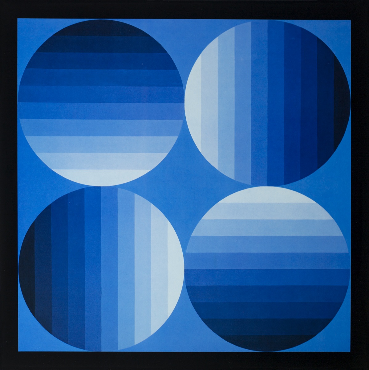 Victor Vasarely est un artiste franco-hongrois considéré comme étant à l’origine du mouvement Op Art ou art optique, que Bridget Riley et Yaacov Agam vont rejoindre. Les peintures et sculptures de Vasarely utilise des formes géométriques et des graphismes colorés pour créer des illusions de profondeur spatiale sur des surfaces à deux dimensions. Cette méthode abstraite de peinture, aussi connue sous le nom d’art cinétique, emprunte aux principes du Bauhaus, de Wassily Kandinsky et du constructivisme, ce qui aura un grand impact sur son travail. Né Vásárhelyi Gyozo le 9 avril 1906 à Pécs en Hongrie, l’artiste étudie d’abord la médecine, puis se tourne vers la peinture deux ans plus tard. Vasarely fréquente la branche hongroise du Bauhaus (Muhely) à Budapest à la fin des années 1920. Après s’être installé à Paris en 1930, Vasarely travaille en tant qu’artiste graphique et développe sa pratique de l’art abstrait géométrique. Il vit et travaille à Paris jusqu’à sa mort à l’âge de 90 ans le 15 mars 1997.