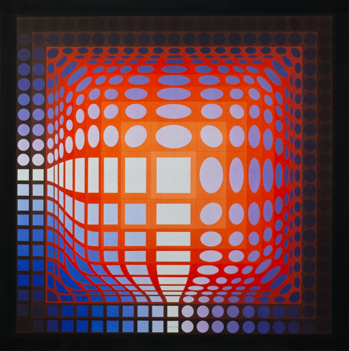 Victor Vasarely est un artiste franco-hongrois considéré comme étant à l’origine du mouvement Op Art ou art optique, que Bridget Riley et Yaacov Agam vont rejoindre. Les peintures et sculptures de Vasarely utilise des formes géométriques et des graphismes colorés pour créer des illusions de profondeur spatiale sur des surfaces à deux dimensions. Cette méthode abstraite de peinture, aussi connue sous le nom d’art cinétique, emprunte aux principes du Bauhaus, de Wassily Kandinsky et du constructivisme, ce qui aura un grand impact sur son travail. Né Vásárhelyi Gyozo le 9 avril 1906 à Pécs en Hongrie, l’artiste étudie d’abord la médecine, puis se tourne vers la peinture deux ans plus tard. Vasarely fréquente la branche hongroise du Bauhaus (Muhely) à Budapest à la fin des années 1920. Après s’être installé à Paris en 1930, Vasarely travaille en tant qu’artiste graphique et développe sa pratique de l’art abstrait géométrique. Il vit et travaille à Paris jusqu’à sa mort à l’âge de 90 ans le 15 mars 1997.