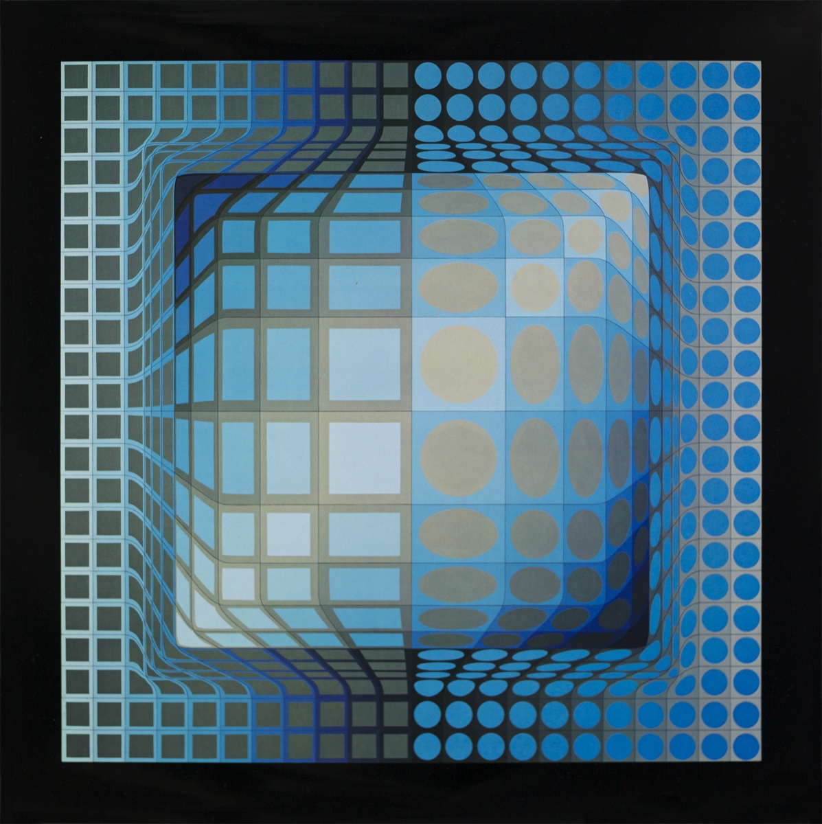 Victor Vasarely est un artiste franco-hongrois considéré comme étant à l’origine du mouvement Op Art ou art optique, que Bridget Riley et Yaacov Agam vont rejoindre. Les peintures et sculptures de Vasarely utilise des formes géométriques et des graphismes colorés pour créer des illusions de profondeur spatiale sur des surfaces à deux dimensions. Cette méthode abstraite de peinture, aussi connue sous le nom d’art cinétique, emprunte aux principes du Bauhaus, de Wassily Kandinsky et du constructivisme, ce qui aura un grand impact sur son travail. Né Vásárhelyi Gyozo le 9 avril 1906 à Pécs en Hongrie, l’artiste étudie d’abord la médecine, puis se tourne vers la peinture deux ans plus tard. Vasarely fréquente la branche hongroise du Bauhaus (Muhely) à Budapest à la fin des années 1920. Après s’être installé à Paris en 1930, Vasarely travaille en tant qu’artiste graphique et développe sa pratique de l’art abstrait géométrique. Il vit et travaille à Paris jusqu’à sa mort à l’âge de 90 ans le 15 mars 1997.