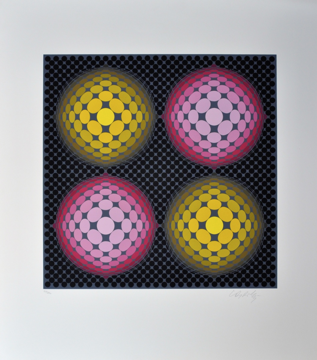 Victor Vasarely est un artiste franco-hongrois considéré comme étant à l’origine du mouvement Op Art ou art optique, que Bridget Riley et Yaacov Agam vont rejoindre. Les peintures et sculptures de Vasarely utilise des formes géométriques et des graphismes colorés pour créer des illusions de profondeur spatiale sur des surfaces à deux dimensions. Cette méthode abstraite de peinture, aussi connue sous le nom d’art cinétique, emprunte aux principes du Bauhaus, de Wassily Kandinsky et du constructivisme, ce qui aura un grand impact sur son travail. Né Vásárhelyi Gyozo le 9 avril 1906 à Pécs en Hongrie, l’artiste étudie d’abord la médecine, puis se tourne vers la peinture deux ans plus tard. Vasarely fréquente la branche hongroise du Bauhaus (Muhely) à Budapest à la fin des années 1920. Après s’être installé à Paris en 1930, Vasarely travaille en tant qu’artiste graphique et développe sa pratique de l’art abstrait géométrique. Il vit et travaille à Paris jusqu’à sa mort à l’âge de 90 ans le 15 mars 1997.