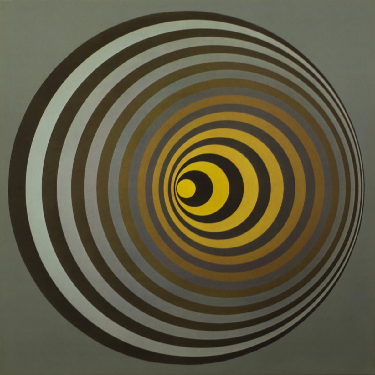 Victor Vasarely est un artiste franco-hongrois considéré comme étant à l’origine du mouvement Op Art ou art optique, que Bridget Riley et Yaacov Agam vont rejoindre. Les peintures et sculptures de Vasarely utilise des formes géométriques et des graphismes colorés pour créer des illusions de profondeur spatiale sur des surfaces à deux dimensions. Cette méthode abstraite de peinture, aussi connue sous le nom d’art cinétique, emprunte aux principes du Bauhaus, de Wassily Kandinsky et du constructivisme, ce qui aura un grand impact sur son travail. Né Vásárhelyi Gyozo le 9 avril 1906 à Pécs en Hongrie, l’artiste étudie d’abord la médecine, puis se tourne vers la peinture deux ans plus tard. Vasarely fréquente la branche hongroise du Bauhaus (Muhely) à Budapest à la fin des années 1920. Après s’être installé à Paris en 1930, Vasarely travaille en tant qu’artiste graphique et développe sa pratique de l’art abstrait géométrique. Il vit et travaille à Paris jusqu’à sa mort à l’âge de 90 ans le 15 mars 1997.