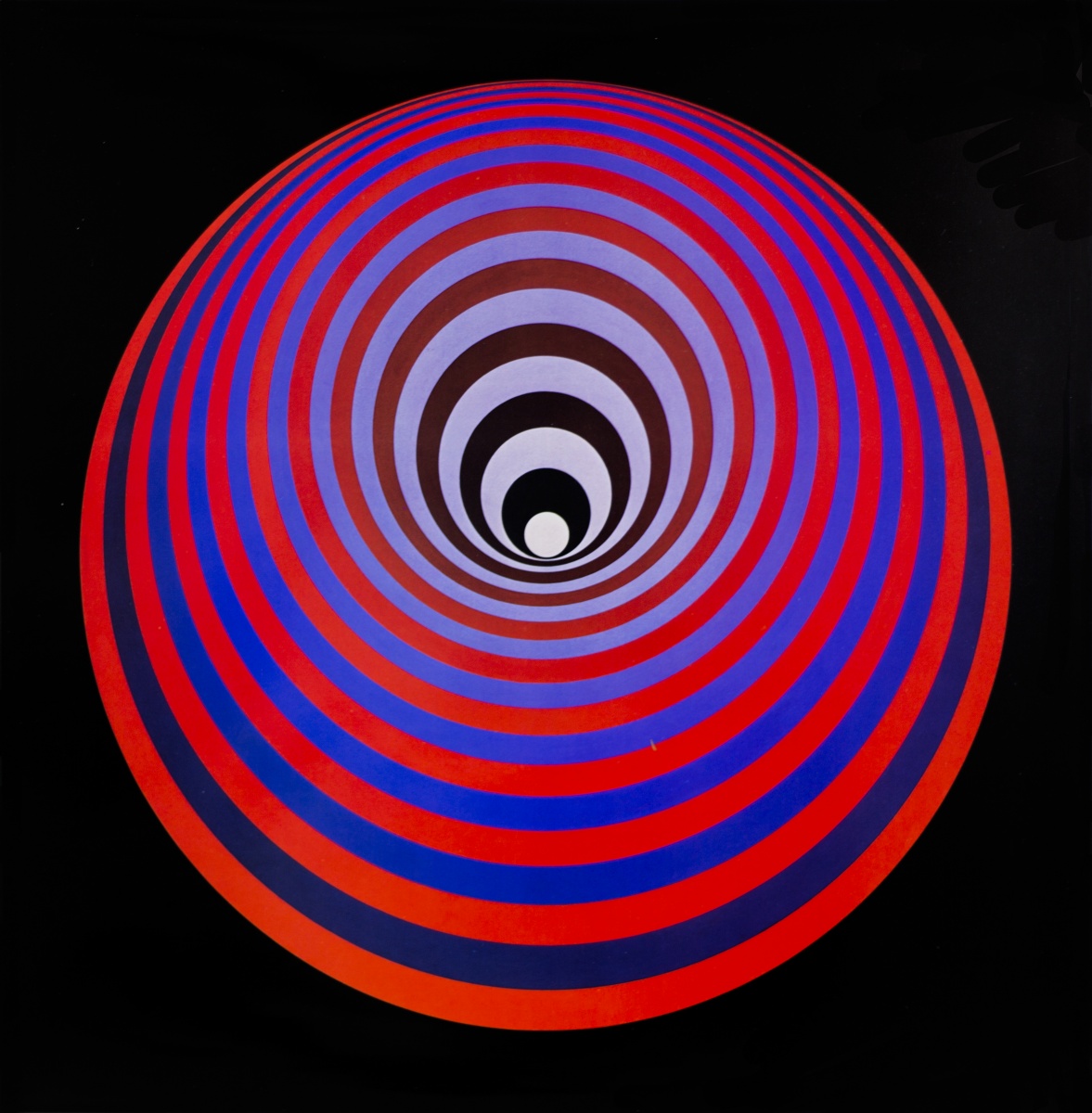 Victor Vasarely est un artiste franco-hongrois considéré comme étant à l’origine du mouvement Op Art ou art optique, que Bridget Riley et Yaacov Agam vont rejoindre. Les peintures et sculptures de Vasarely utilise des formes géométriques et des graphismes colorés pour créer des illusions de profondeur spatiale sur des surfaces à deux dimensions. Cette méthode abstraite de peinture, aussi connue sous le nom d’art cinétique, emprunte aux principes du Bauhaus, de Wassily Kandinsky et du constructivisme, ce qui aura un grand impact sur son travail. Né Vásárhelyi Gyozo le 9 avril 1906 à Pécs en Hongrie, l’artiste étudie d’abord la médecine, puis se tourne vers la peinture deux ans plus tard. Vasarely fréquente la branche hongroise du Bauhaus (Muhely) à Budapest à la fin des années 1920. Après s’être installé à Paris en 1930, Vasarely travaille en tant qu’artiste graphique et développe sa pratique de l’art abstrait géométrique. Il vit et travaille à Paris jusqu’à sa mort à l’âge de 90 ans le 15 mars 1997.