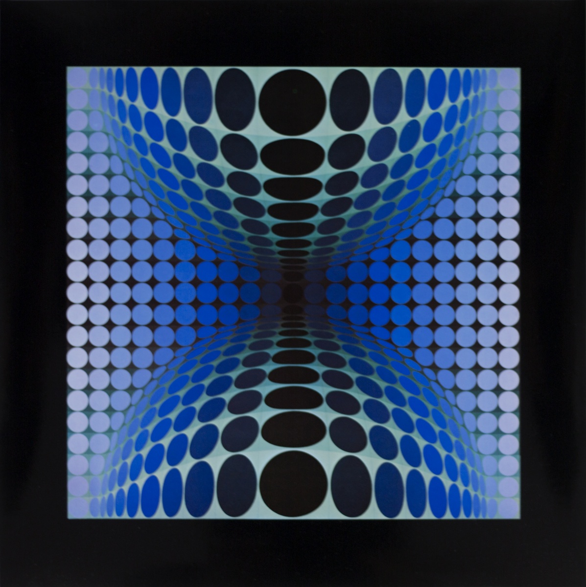 Victor Vasarely est un artiste franco-hongrois considéré comme étant à l’origine du mouvement Op Art ou art optique, que Bridget Riley et Yaacov Agam vont rejoindre. Les peintures et sculptures de Vasarely utilise des formes géométriques et des graphismes colorés pour créer des illusions de profondeur spatiale sur des surfaces à deux dimensions. Cette méthode abstraite de peinture, aussi connue sous le nom d’art cinétique, emprunte aux principes du Bauhaus, de Wassily Kandinsky et du constructivisme, ce qui aura un grand impact sur son travail. Né Vásárhelyi Gyozo le 9 avril 1906 à Pécs en Hongrie, l’artiste étudie d’abord la médecine, puis se tourne vers la peinture deux ans plus tard. Vasarely fréquente la branche hongroise du Bauhaus (Muhely) à Budapest à la fin des années 1920. Après s’être installé à Paris en 1930, Vasarely travaille en tant qu’artiste graphique et développe sa pratique de l’art abstrait géométrique. Il vit et travaille à Paris jusqu’à sa mort à l’âge de 90 ans le 15 mars 1997.
