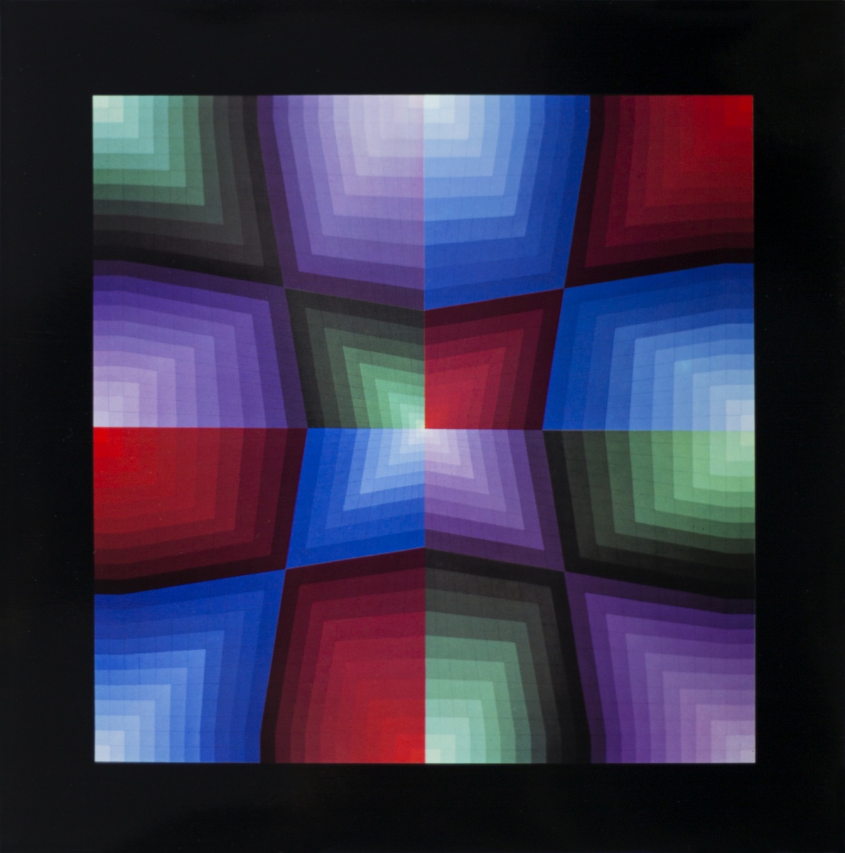 Victor Vasarely est un artiste franco-hongrois considéré comme étant à l’origine du mouvement Op Art ou art optique, que Bridget Riley et Yaacov Agam vont rejoindre. Les peintures et sculptures de Vasarely utilise des formes géométriques et des graphismes colorés pour créer des illusions de profondeur spatiale sur des surfaces à deux dimensions. Cette méthode abstraite de peinture, aussi connue sous le nom d’art cinétique, emprunte aux principes du Bauhaus, de Wassily Kandinsky et du constructivisme, ce qui aura un grand impact sur son travail. Né Vásárhelyi Gyozo le 9 avril 1906 à Pécs en Hongrie, l’artiste étudie d’abord la médecine, puis se tourne vers la peinture deux ans plus tard. Vasarely fréquente la branche hongroise du Bauhaus (Muhely) à Budapest à la fin des années 1920. Après s’être installé à Paris en 1930, Vasarely travaille en tant qu’artiste graphique et développe sa pratique de l’art abstrait géométrique. Il vit et travaille à Paris jusqu’à sa mort à l’âge de 90 ans le 15 mars 1997.