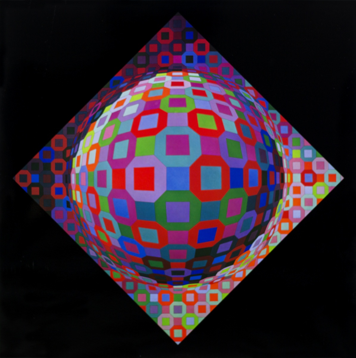 Victor Vasarely est un artiste franco-hongrois considéré comme étant à l’origine du mouvement Op Art ou art optique, que Bridget Riley et Yaacov Agam vont rejoindre. Les peintures et sculptures de Vasarely utilise des formes géométriques et des graphismes colorés pour créer des illusions de profondeur spatiale sur des surfaces à deux dimensions. Cette méthode abstraite de peinture, aussi connue sous le nom d’art cinétique, emprunte aux principes du Bauhaus, de Wassily Kandinsky et du constructivisme, ce qui aura un grand impact sur son travail. Né Vásárhelyi Gyozo le 9 avril 1906 à Pécs en Hongrie, l’artiste étudie d’abord la médecine, puis se tourne vers la peinture deux ans plus tard. Vasarely fréquente la branche hongroise du Bauhaus (Muhely) à Budapest à la fin des années 1920. Après s’être installé à Paris en 1930, Vasarely travaille en tant qu’artiste graphique et développe sa pratique de l’art abstrait géométrique. Il vit et travaille à Paris jusqu’à sa mort à l’âge de 90 ans le 15 mars 1997.
