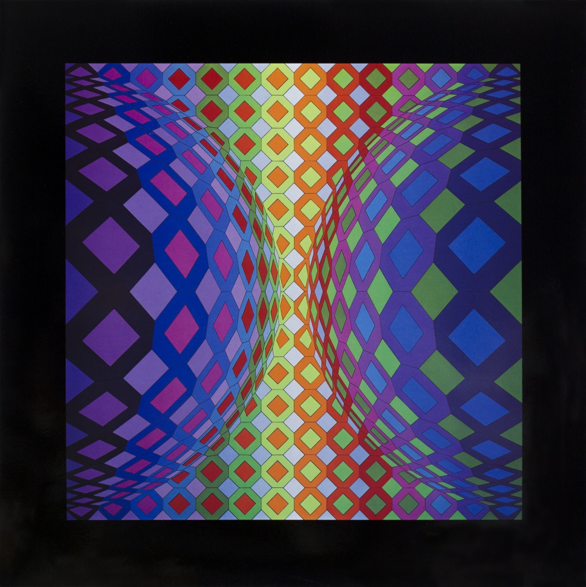 Victor Vasarely est un artiste franco-hongrois considéré comme étant à l’origine du mouvement Op Art ou art optique, que Bridget Riley et Yaacov Agam vont rejoindre. Les peintures et sculptures de Vasarely utilise des formes géométriques et des graphismes colorés pour créer des illusions de profondeur spatiale sur des surfaces à deux dimensions. Cette méthode abstraite de peinture, aussi connue sous le nom d’art cinétique, emprunte aux principes du Bauhaus, de Wassily Kandinsky et du constructivisme, ce qui aura un grand impact sur son travail. Né Vásárhelyi Gyozo le 9 avril 1906 à Pécs en Hongrie, l’artiste étudie d’abord la médecine, puis se tourne vers la peinture deux ans plus tard. Vasarely fréquente la branche hongroise du Bauhaus (Muhely) à Budapest à la fin des années 1920. Après s’être installé à Paris en 1930, Vasarely travaille en tant qu’artiste graphique et développe sa pratique de l’art abstrait géométrique. Il vit et travaille à Paris jusqu’à sa mort à l’âge de 90 ans le 15 mars 1997.