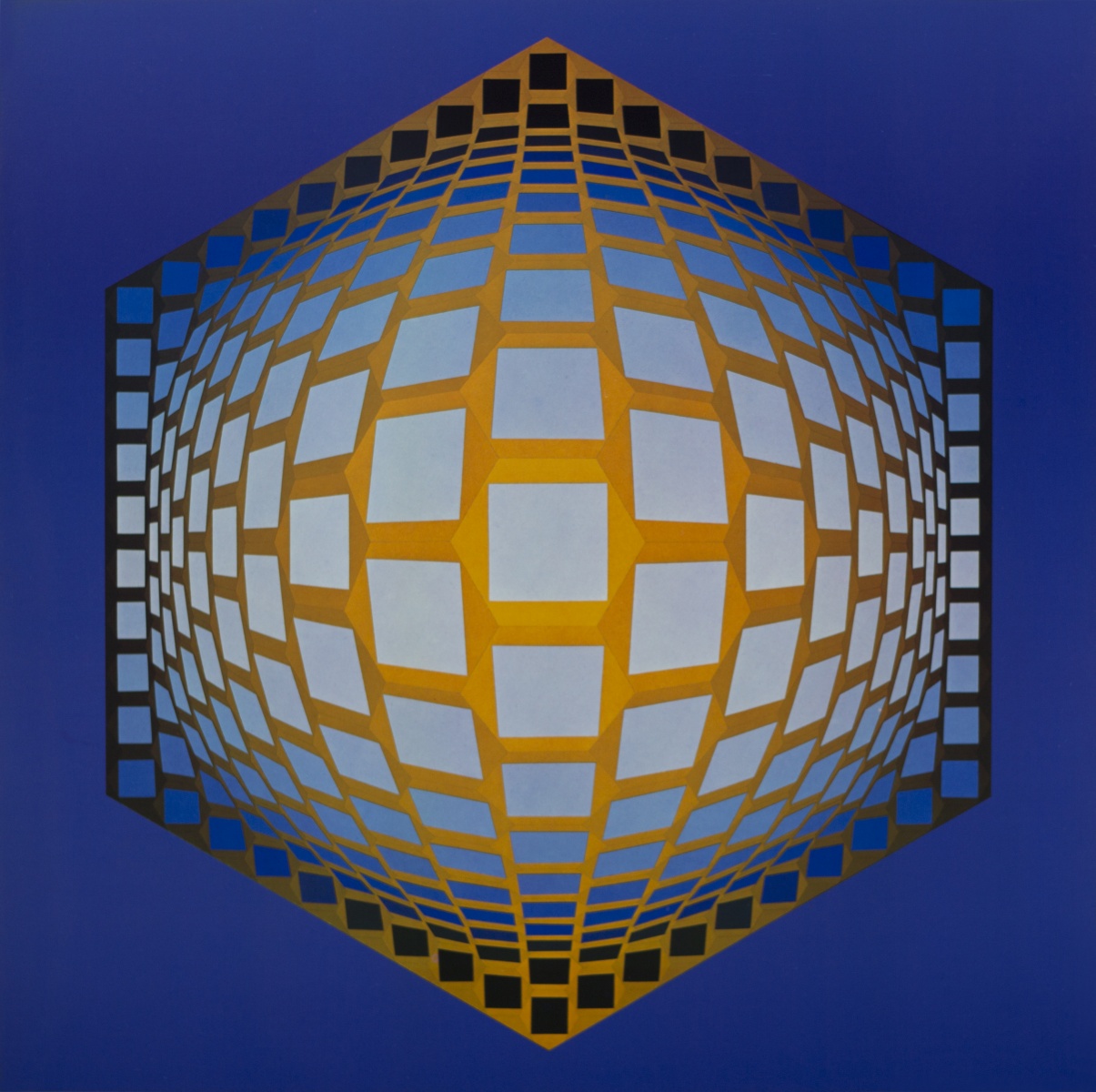 Victor Vasarely est un artiste franco-hongrois considéré comme étant à l’origine du mouvement Op Art ou art optique, que Bridget Riley et Yaacov Agam vont rejoindre. Les peintures et sculptures de Vasarely utilise des formes géométriques et des graphismes colorés pour créer des illusions de profondeur spatiale sur des surfaces à deux dimensions. Cette méthode abstraite de peinture, aussi connue sous le nom d’art cinétique, emprunte aux principes du Bauhaus, de Wassily Kandinsky et du constructivisme, ce qui aura un grand impact sur son travail. Né Vásárhelyi Gyozo le 9 avril 1906 à Pécs en Hongrie, l’artiste étudie d’abord la médecine, puis se tourne vers la peinture deux ans plus tard. Vasarely fréquente la branche hongroise du Bauhaus (Muhely) à Budapest à la fin des années 1920. Après s’être installé à Paris en 1930, Vasarely travaille en tant qu’artiste graphique et développe sa pratique de l’art abstrait géométrique. Il vit et travaille à Paris jusqu’à sa mort à l’âge de 90 ans le 15 mars 1997.