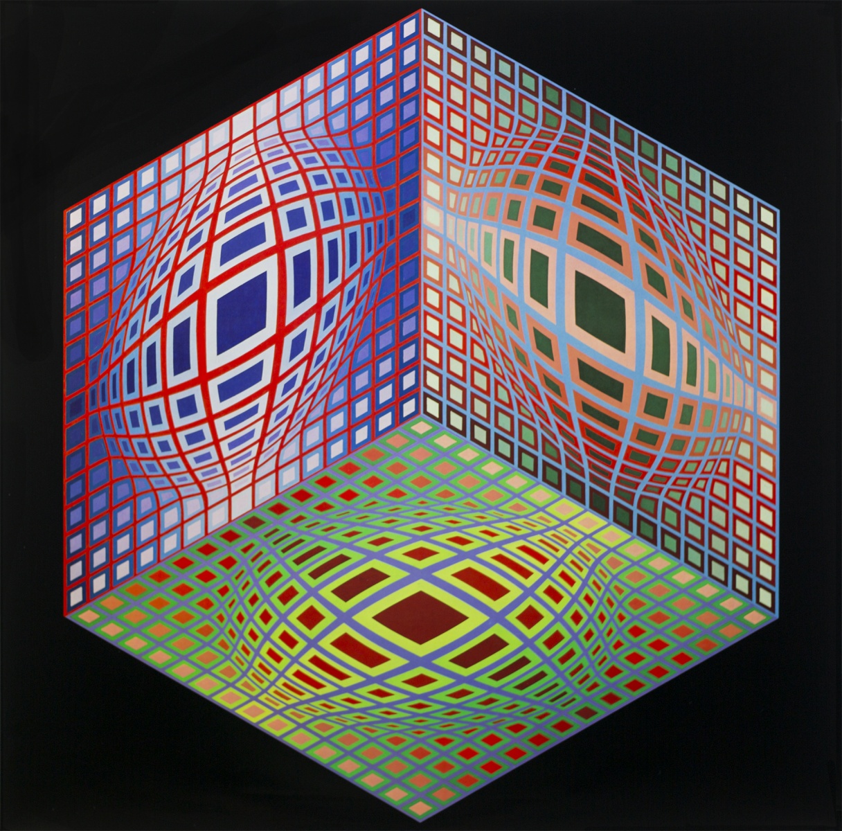 Victor Vasarely est un artiste franco-hongrois considéré comme étant à l’origine du mouvement Op Art ou art optique, que Bridget Riley et Yaacov Agam vont rejoindre. Les peintures et sculptures de Vasarely utilise des formes géométriques et des graphismes colorés pour créer des illusions de profondeur spatiale sur des surfaces à deux dimensions. Cette méthode abstraite de peinture, aussi connue sous le nom d’art cinétique, emprunte aux principes du Bauhaus, de Wassily Kandinsky et du constructivisme, ce qui aura un grand impact sur son travail. Né Vásárhelyi Gyozo le 9 avril 1906 à Pécs en Hongrie, l’artiste étudie d’abord la médecine, puis se tourne vers la peinture deux ans plus tard. Vasarely fréquente la branche hongroise du Bauhaus (Muhely) à Budapest à la fin des années 1920. Après s’être installé à Paris en 1930, Vasarely travaille en tant qu’artiste graphique et développe sa pratique de l’art abstrait géométrique. Il vit et travaille à Paris jusqu’à sa mort à l’âge de 90 ans le 15 mars 1997.