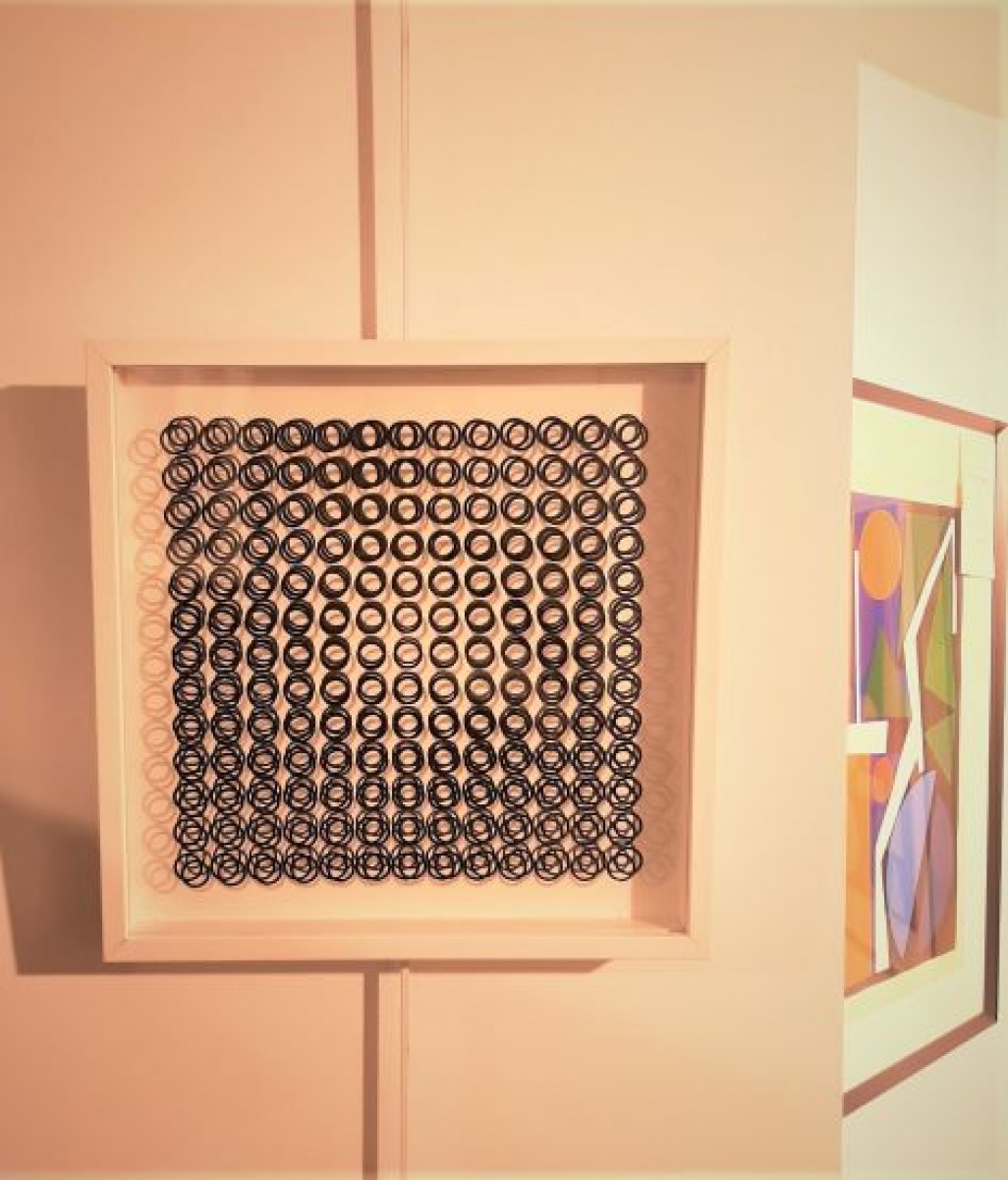 Oeuvre comprenant un bristol fond blanc en fond et un dessin en noir sur transparent en premier plan.