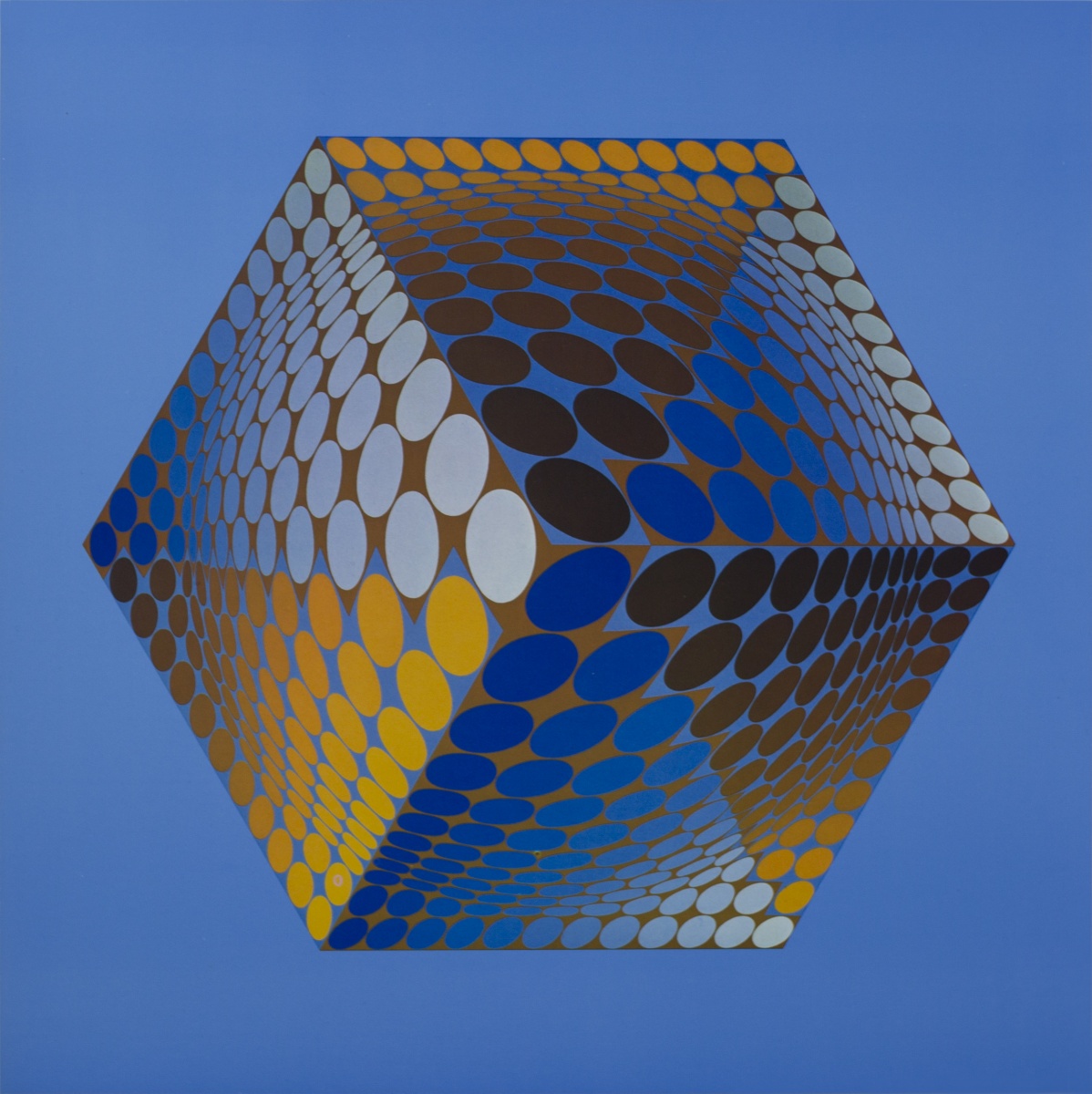 Victor Vasarely est un artiste franco-hongrois considéré comme étant à l’origine du mouvement Op Art ou art optique, que Bridget Riley et Yaacov Agam vont rejoindre. Les peintures et sculptures de Vasarely utilise des formes géométriques et des graphismes colorés pour créer des illusions de profondeur spatiale sur des surfaces à deux dimensions. Cette méthode abstraite de peinture, aussi connue sous le nom d’art cinétique, emprunte aux principes du Bauhaus, de Wassily Kandinsky et du constructivisme, ce qui aura un grand impact sur son travail. Né Vásárhelyi Gyozo le 9 avril 1906 à Pécs en Hongrie, l’artiste étudie d’abord la médecine, puis se tourne vers la peinture deux ans plus tard. Vasarely fréquente la branche hongroise du Bauhaus (Muhely) à Budapest à la fin des années 1920. Après s’être installé à Paris en 1930, Vasarely travaille en tant qu’artiste graphique et développe sa pratique de l’art abstrait géométrique. Il vit et travaille à Paris jusqu’à sa mort à l’âge de 90 ans le 15 mars 1997.