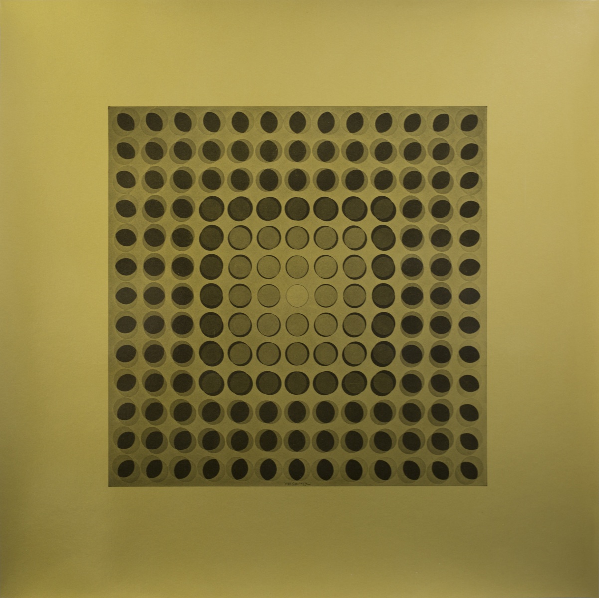 Victor Vasarely est un artiste franco-hongrois considéré comme étant à l’origine du mouvement Op Art ou art optique, que Bridget Riley et Yaacov Agam vont rejoindre. Les peintures et sculptures de Vasarely utilise des formes géométriques et des graphismes colorés pour créer des illusions de profondeur spatiale sur des surfaces à deux dimensions. Cette méthode abstraite de peinture, aussi connue sous le nom d’art cinétique, emprunte aux principes du Bauhaus, de Wassily Kandinsky et du constructivisme, ce qui aura un grand impact sur son travail. Né Vásárhelyi Gyozo le 9 avril 1906 à Pécs en Hongrie, l’artiste étudie d’abord la médecine, puis se tourne vers la peinture deux ans plus tard. Vasarely fréquente la branche hongroise du Bauhaus (Muhely) à Budapest à la fin des années 1920. Après s’être installé à Paris en 1930, Vasarely travaille en tant qu’artiste graphique et développe sa pratique de l’art abstrait géométrique. Il vit et travaille à Paris jusqu’à sa mort à l’âge de 90 ans le 15 mars 1997.