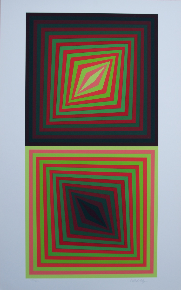 Victor Vasarely est un artiste franco-hongrois considéré comme étant à l’origine du mouvement Op Art ou art optique, que Bridget Riley et Yaacov Agam vont rejoindre. Les peintures et sculptures de Vasarely utilise des formes géométriques et des graphismes colorés pour créer des illusions de profondeur spatiale sur des surfaces à deux dimensions. Cette méthode abstraite de peinture, aussi connue sous le nom d’art cinétique, emprunte aux principes du Bauhaus, de Wassily Kandinsky et du constructivisme, ce qui aura un grand impact sur son travail. Né Vásárhelyi Gyozo le 9 avril 1906 à Pécs en Hongrie, l’artiste étudie d’abord la médecine, puis se tourne vers la peinture deux ans plus tard. Vasarely fréquente la branche hongroise du Bauhaus (Muhely) à Budapest à la fin des années 1920. Après s’être installé à Paris en 1930, Vasarely travaille en tant qu’artiste graphique et développe sa pratique de l’art abstrait géométrique. Il vit et travaille à Paris jusqu’à sa mort à l’âge de 90 ans le 15 mars 1997.