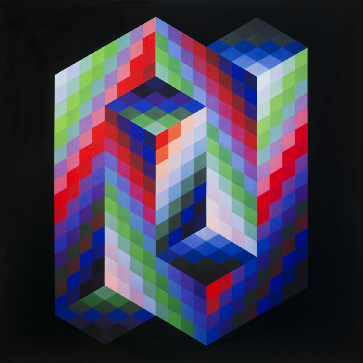 Victor Vasarely est un artiste franco-hongrois considéré comme étant à l’origine du mouvement Op Art ou art optique, que Bridget Riley et Yaacov Agam vont rejoindre. Les peintures et sculptures de Vasarely utilise des formes géométriques et des graphismes colorés pour créer des illusions de profondeur spatiale sur des surfaces à deux dimensions. Cette méthode abstraite de peinture, aussi connue sous le nom d’art cinétique, emprunte aux principes du Bauhaus, de Wassily Kandinsky et du constructivisme, ce qui aura un grand impact sur son travail. Né Vásárhelyi Gyozo le 9 avril 1906 à Pécs en Hongrie, l’artiste étudie d’abord la médecine, puis se tourne vers la peinture deux ans plus tard. Vasarely fréquente la branche hongroise du Bauhaus (Muhely) à Budapest à la fin des années 1920. Après s’être installé à Paris en 1930, Vasarely travaille en tant qu’artiste graphique et développe sa pratique de l’art abstrait géométrique. Il vit et travaille à Paris jusqu’à sa mort à l’âge de 90 ans le 15 mars 1997.