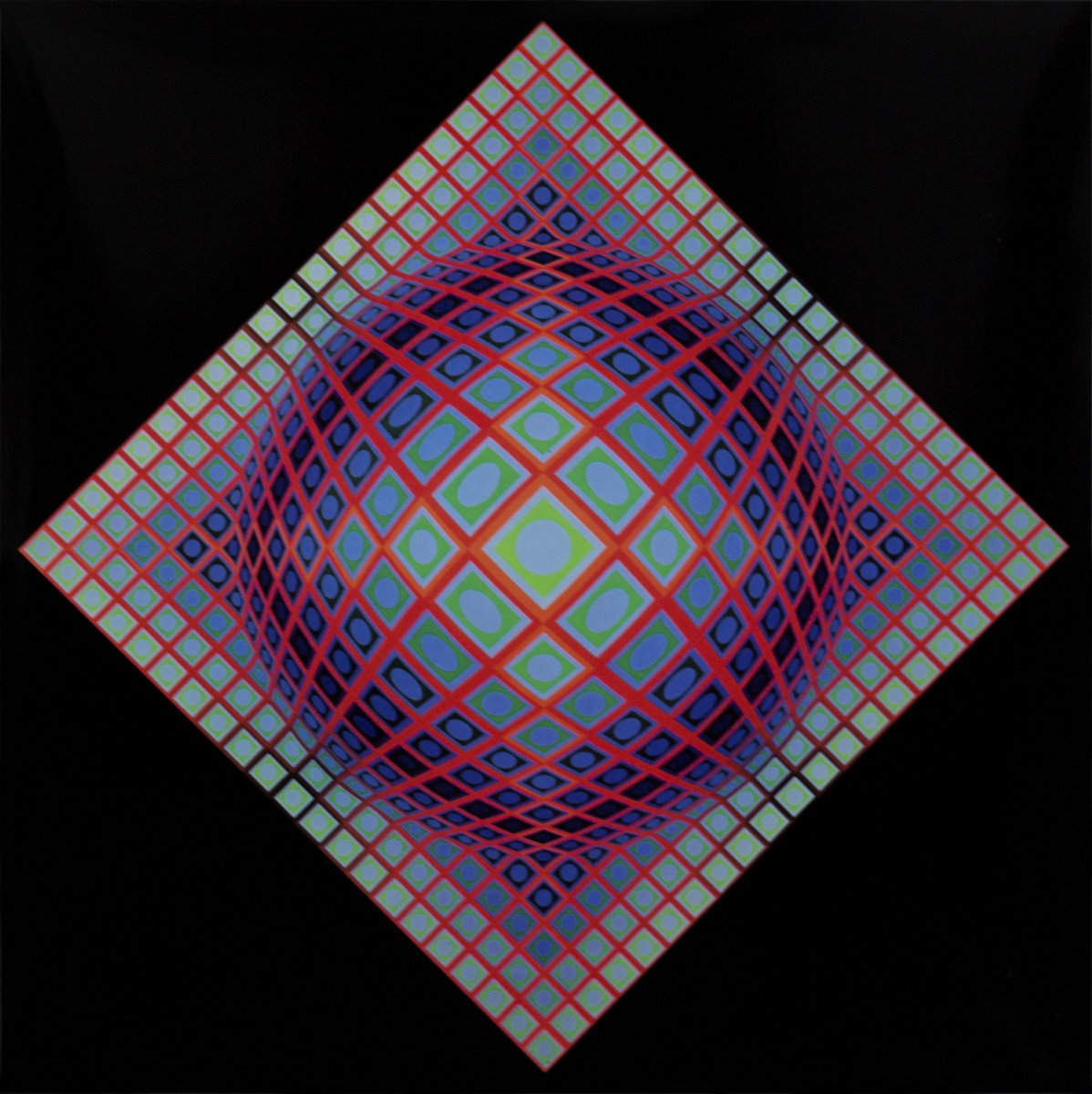 Victor Vasarely est un artiste franco-hongrois considéré comme étant à l’origine du mouvement Op Art ou art optique, que Bridget Riley et Yaacov Agam vont rejoindre. Les peintures et sculptures de Vasarely utilise des formes géométriques et des graphismes colorés pour créer des illusions de profondeur spatiale sur des surfaces à deux dimensions. Cette méthode abstraite de peinture, aussi connue sous le nom d’art cinétique, emprunte aux principes du Bauhaus, de Wassily Kandinsky et du constructivisme, ce qui aura un grand impact sur son travail. Né Vásárhelyi Gyozo le 9 avril 1906 à Pécs en Hongrie, l’artiste étudie d’abord la médecine, puis se tourne vers la peinture deux ans plus tard. Vasarely fréquente la branche hongroise du Bauhaus (Muhely) à Budapest à la fin des années 1920. Après s’être installé à Paris en 1930, Vasarely travaille en tant qu’artiste graphique et développe sa pratique de l’art abstrait géométrique. Il vit et travaille à Paris jusqu’à sa mort à l’âge de 90 ans le 15 mars 1997.