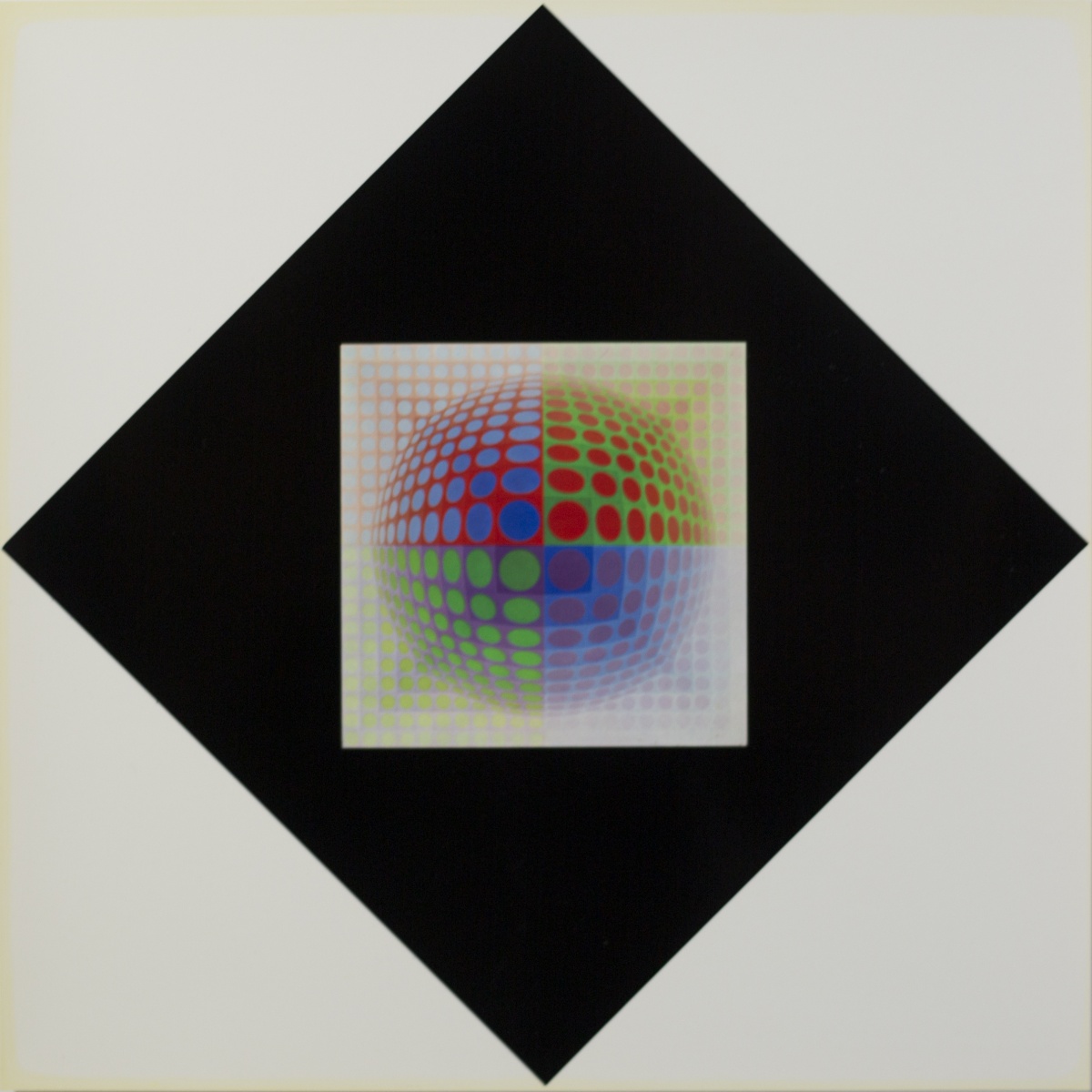 Victor Vasarely est un artiste franco-hongrois considéré comme étant à l’origine du mouvement Op Art ou art optique, que Bridget Riley et Yaacov Agam vont rejoindre. Les peintures et sculptures de Vasarely utilise des formes géométriques et des graphismes colorés pour créer des illusions de profondeur spatiale sur des surfaces à deux dimensions. Cette méthode abstraite de peinture, aussi connue sous le nom d’art cinétique, emprunte aux principes du Bauhaus, de Wassily Kandinsky et du constructivisme, ce qui aura un grand impact sur son travail. Né Vásárhelyi Gyozo le 9 avril 1906 à Pécs en Hongrie, l’artiste étudie d’abord la médecine, puis se tourne vers la peinture deux ans plus tard. Vasarely fréquente la branche hongroise du Bauhaus (Muhely) à Budapest à la fin des années 1920. Après s’être installé à Paris en 1930, Vasarely travaille en tant qu’artiste graphique et développe sa pratique de l’art abstrait géométrique. Il vit et travaille à Paris jusqu’à sa mort à l’âge de 90 ans le 15 mars 1997.