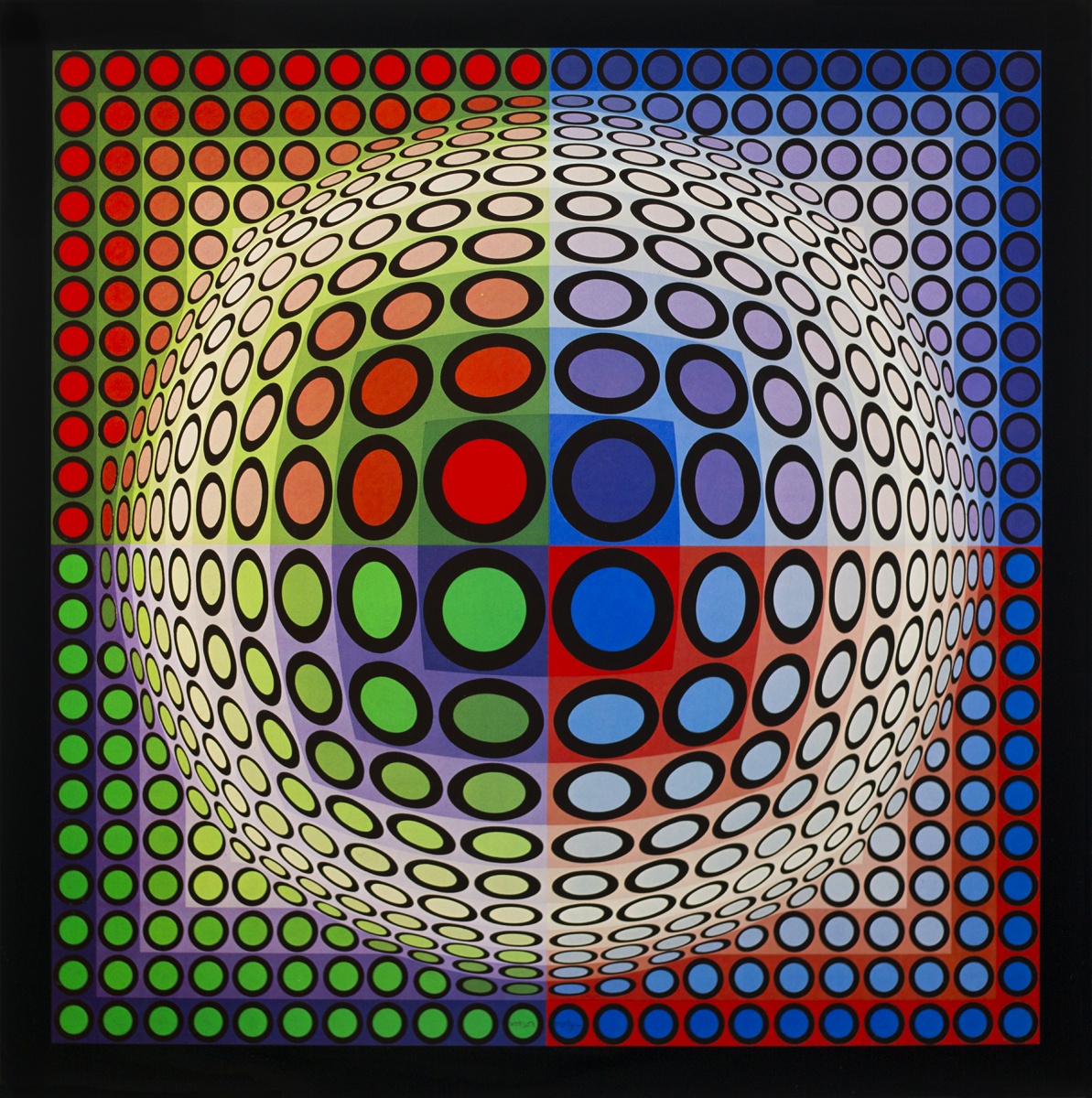 Victor Vasarely est un artiste franco-hongrois considéré comme étant à l’origine du mouvement Op Art ou art optique, que Bridget Riley et Yaacov Agam vont rejoindre. Les peintures et sculptures de Vasarely utilise des formes géométriques et des graphismes colorés pour créer des illusions de profondeur spatiale sur des surfaces à deux dimensions. Cette méthode abstraite de peinture, aussi connue sous le nom d’art cinétique, emprunte aux principes du Bauhaus, de Wassily Kandinsky et du constructivisme, ce qui aura un grand impact sur son travail. Né Vásárhelyi Gyozo le 9 avril 1906 à Pécs en Hongrie, l’artiste étudie d’abord la médecine, puis se tourne vers la peinture deux ans plus tard. Vasarely fréquente la branche hongroise du Bauhaus (Muhely) à Budapest à la fin des années 1920. Après s’être installé à Paris en 1930, Vasarely travaille en tant qu’artiste graphique et développe sa pratique de l’art abstrait géométrique. Il vit et travaille à Paris jusqu’à sa mort à l’âge de 90 ans le 15 mars 1997.