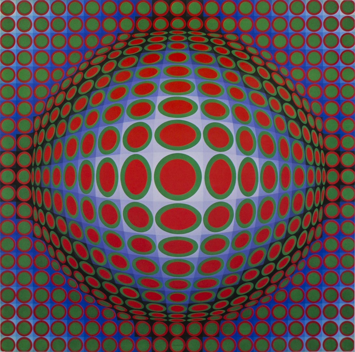 Victor Vasarely est un artiste franco-hongrois considéré comme étant à l’origine du mouvement Op Art ou art optique, que Bridget Riley et Yaacov Agam vont rejoindre. Les peintures et sculptures de Vasarely utilise des formes géométriques et des graphismes colorés pour créer des illusions de profondeur spatiale sur des surfaces à deux dimensions. Cette méthode abstraite de peinture, aussi connue sous le nom d’art cinétique, emprunte aux principes du Bauhaus, de Wassily Kandinsky et du constructivisme, ce qui aura un grand impact sur son travail. Né Vásárhelyi Gyozo le 9 avril 1906 à Pécs en Hongrie, l’artiste étudie d’abord la médecine, puis se tourne vers la peinture deux ans plus tard. Vasarely fréquente la branche hongroise du Bauhaus (Muhely) à Budapest à la fin des années 1920. Après s’être installé à Paris en 1930, Vasarely travaille en tant qu’artiste graphique et développe sa pratique de l’art abstrait géométrique. Il vit et travaille à Paris jusqu’à sa mort à l’âge de 90 ans le 15 mars 1997.