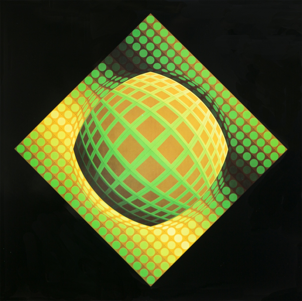 Victor Vasarely est un artiste franco-hongrois considéré comme étant à l’origine du mouvement Op Art ou art optique, que Bridget Riley et Yaacov Agam vont rejoindre. Les peintures et sculptures de Vasarely utilise des formes géométriques et des graphismes colorés pour créer des illusions de profondeur spatiale sur des surfaces à deux dimensions. Cette méthode abstraite de peinture, aussi connue sous le nom d’art cinétique, emprunte aux principes du Bauhaus, de Wassily Kandinsky et du constructivisme, ce qui aura un grand impact sur son travail. Né Vásárhelyi Gyozo le 9 avril 1906 à Pécs en Hongrie, l’artiste étudie d’abord la médecine, puis se tourne vers la peinture deux ans plus tard. Vasarely fréquente la branche hongroise du Bauhaus (Muhely) à Budapest à la fin des années 1920. Après s’être installé à Paris en 1930, Vasarely travaille en tant qu’artiste graphique et développe sa pratique de l’art abstrait géométrique. Il vit et travaille à Paris jusqu’à sa mort à l’âge de 90 ans le 15 mars 1997.